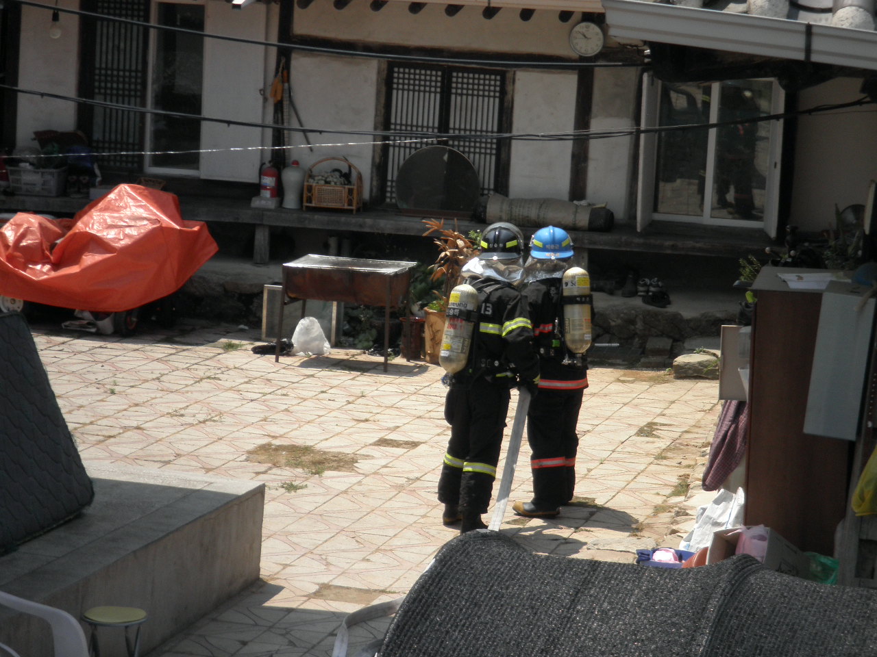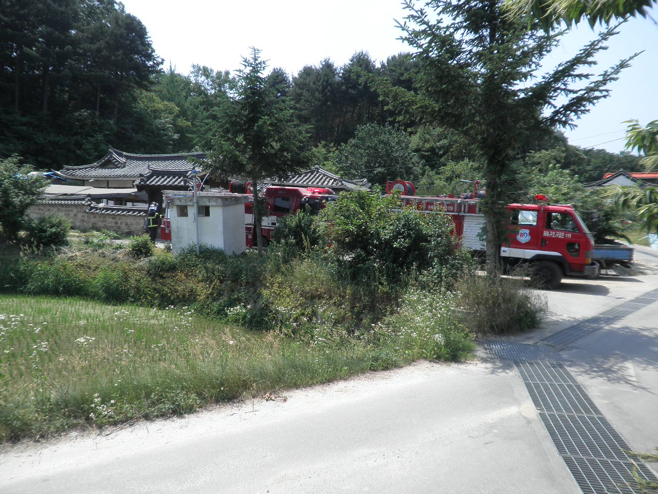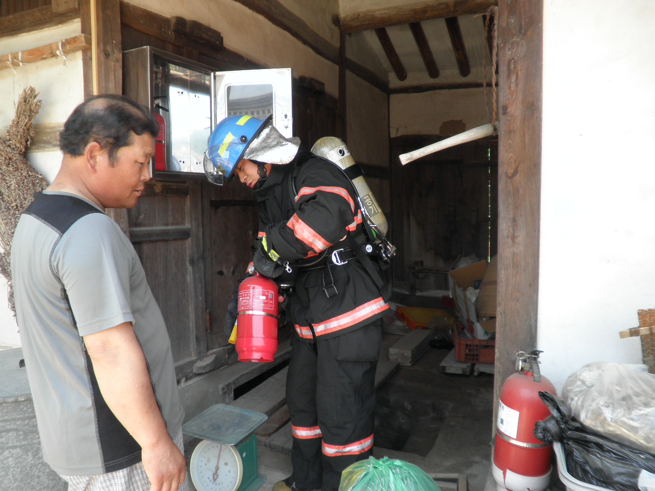 금일(6월 16일) 석사센터(센터장 소방위 반종범)에서는 최재근 주택(문화재자료 65호)을 대상으로 목조문화재 현장 출동 적응훈련을 실시하였습니다. 초기 화재진압 및 대피훈련을 실시하였으며 소화기 사용요령 교육도 행해졌습니다.