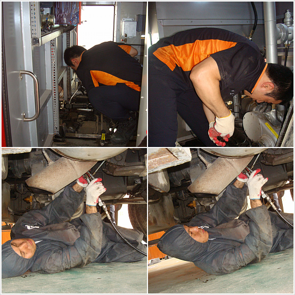 무더운 날씨속에 작업복을 착용하고 61호 펌프, 32호 물탱크에 구리스주입, 오일점검 등 챠량 곳곳을 점검 보수 하였습니다.