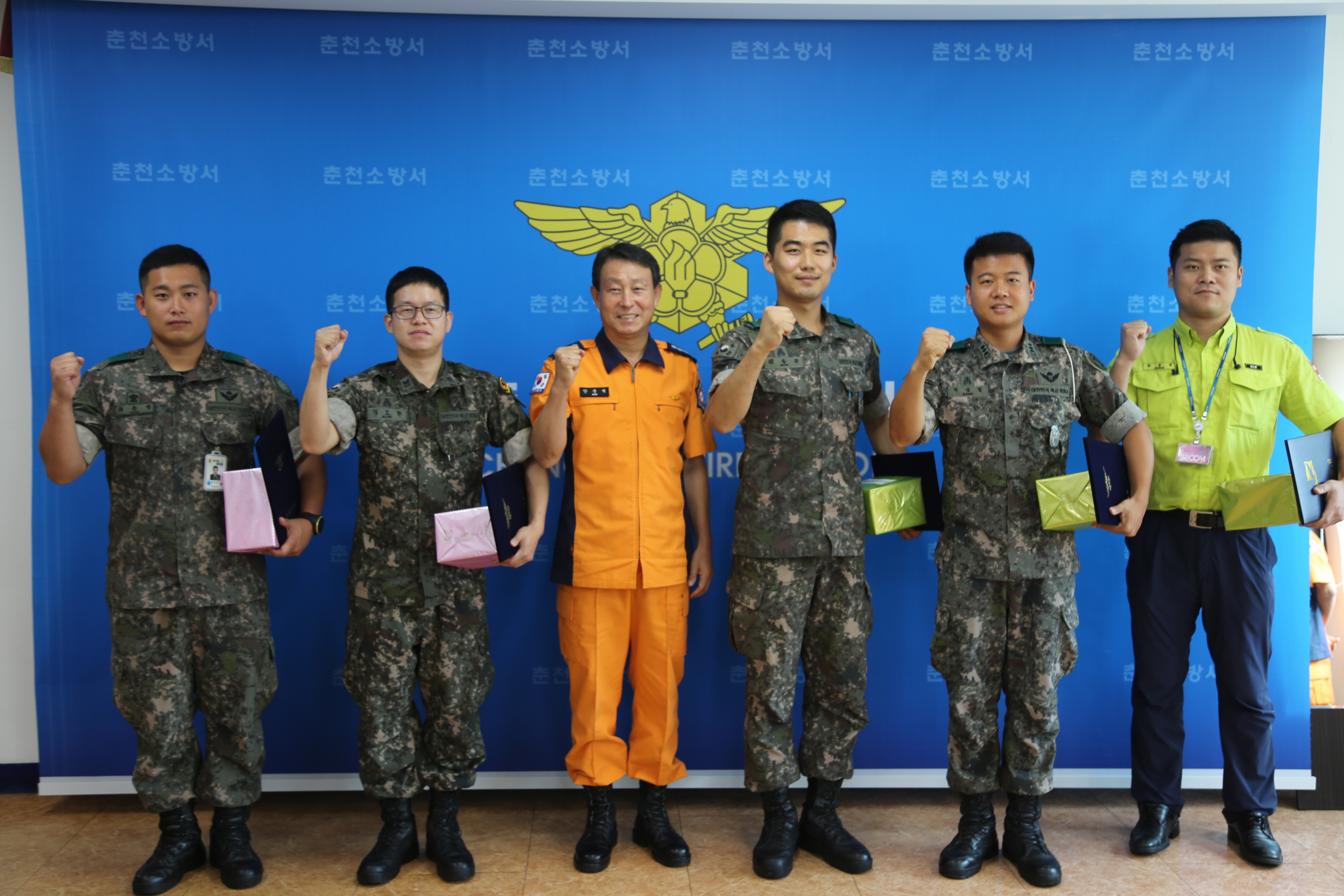 이날 표창을 받은 황윤중(38) 보안업체 직원은 지난 6월 24일 07:17 분경 춘천시 약사동 159-1번지(DC마트 약사점)에서 발생한 창고화재 시 적극적인 화재진압 활동으로 매장 전체로의 연소 확대를 차단하였고 박광범(30) 대위와 김종근(26) 중위, 김요한(33) 중사는 8월 10일 21:10 분경 춘천시 신북읍 용산리 601번지에서 발생한 우사화재에서, 최준영(23) 하사는 8월 14일 17:41경 화천군 상서면 신대리 812-2번지에서 발생한 창고화재 시 신속한 화재진압 활동으로 재산피해를 경감시켰다.