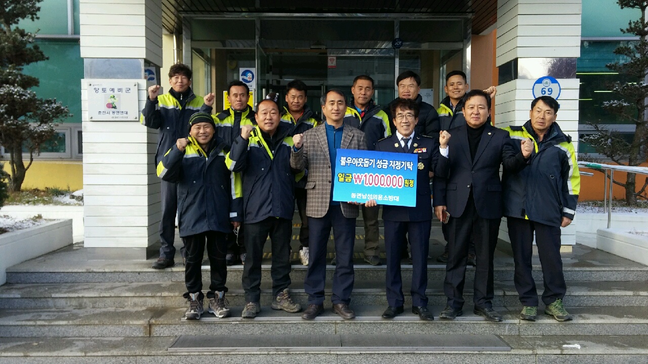 춘천소방서 동면의용소방대(대장 염순직)는 28일 오전 11시 동면사무소에서 지난 7월초 동면 지내리 일대 600평 규모의 밭에 심은 서리태콩 수익금을 불우이웃돕기 성금으로 사용해 달라며 성금 100만원을 기탁했다.