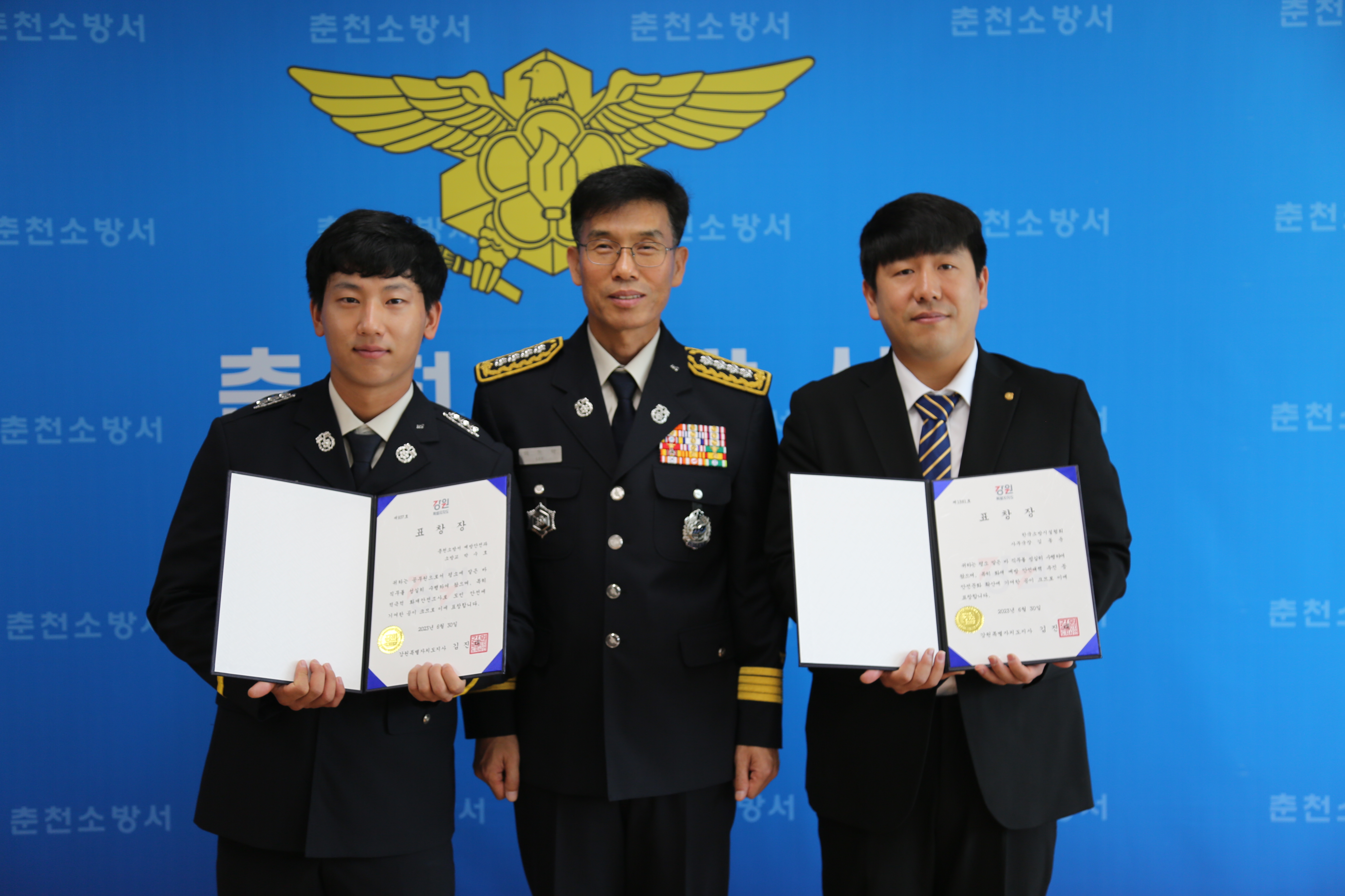 소방서는 예방안전과 소방교 박수호, 한국소방시설협회 강원지부 사무국장 김동운에게 강원도지사 표창을 수여했다.