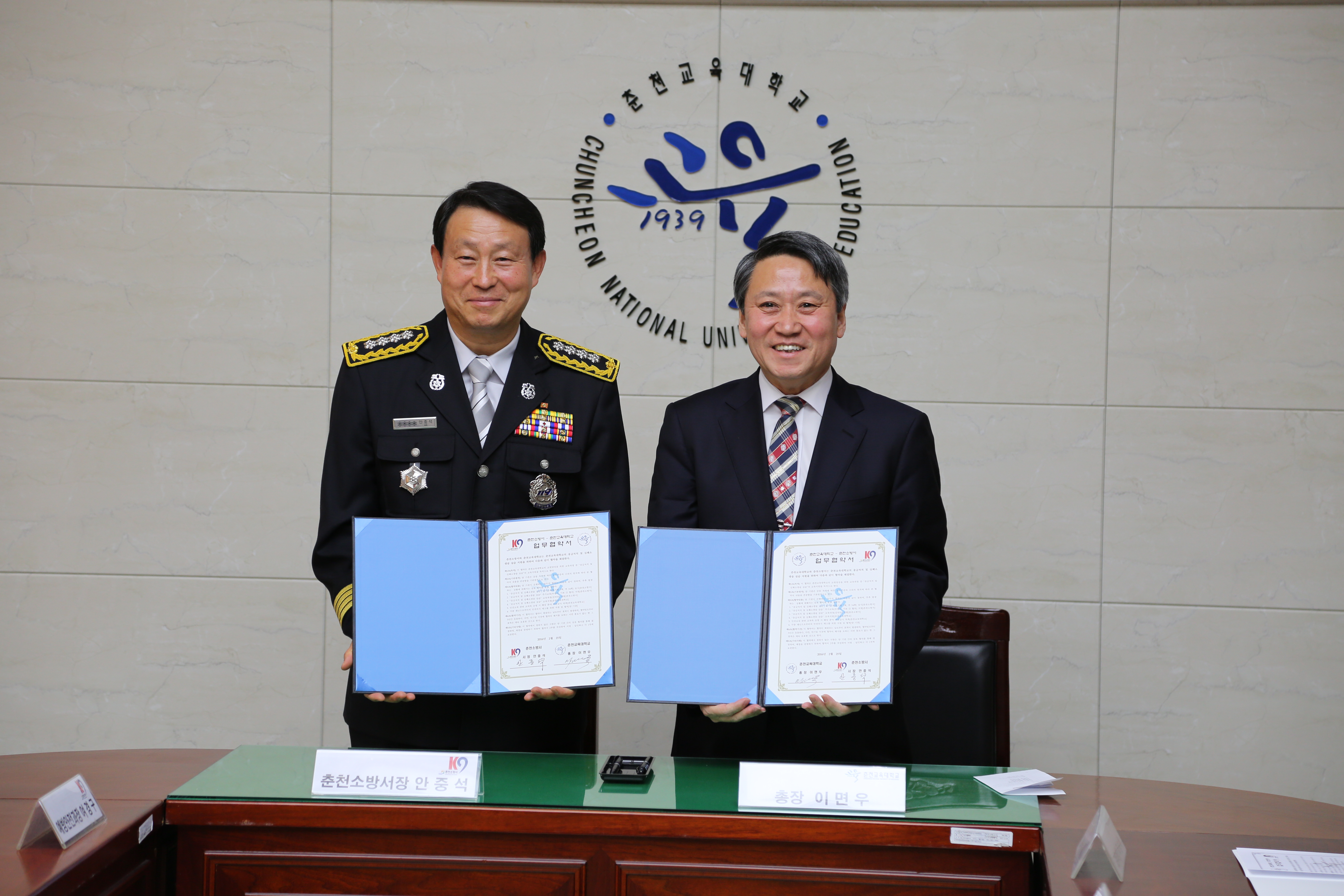 안중석 춘천소방서장과 이면우 춘천교육대학 총장이 업무협약서에 싸인 후 기념촬영을 하였다.