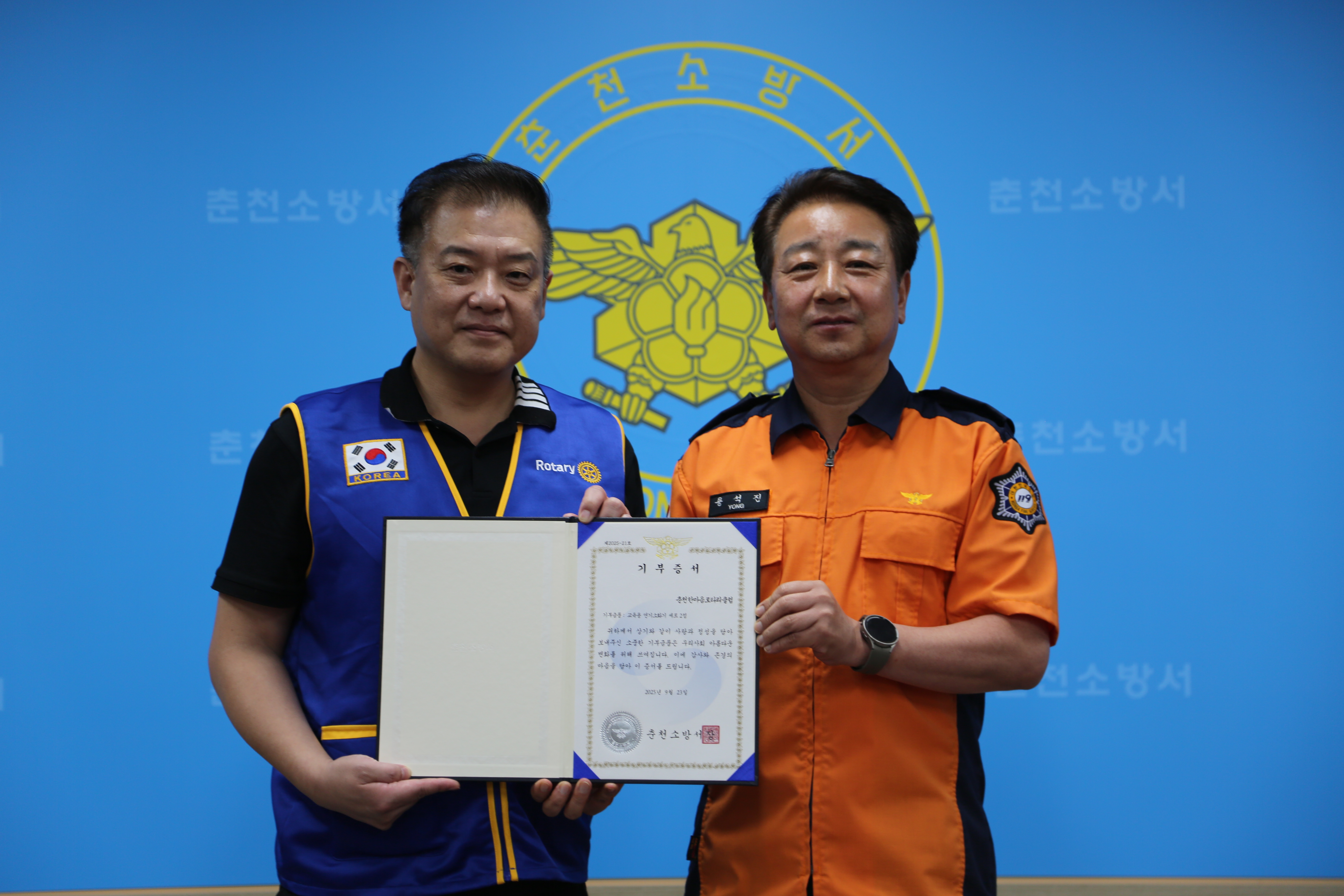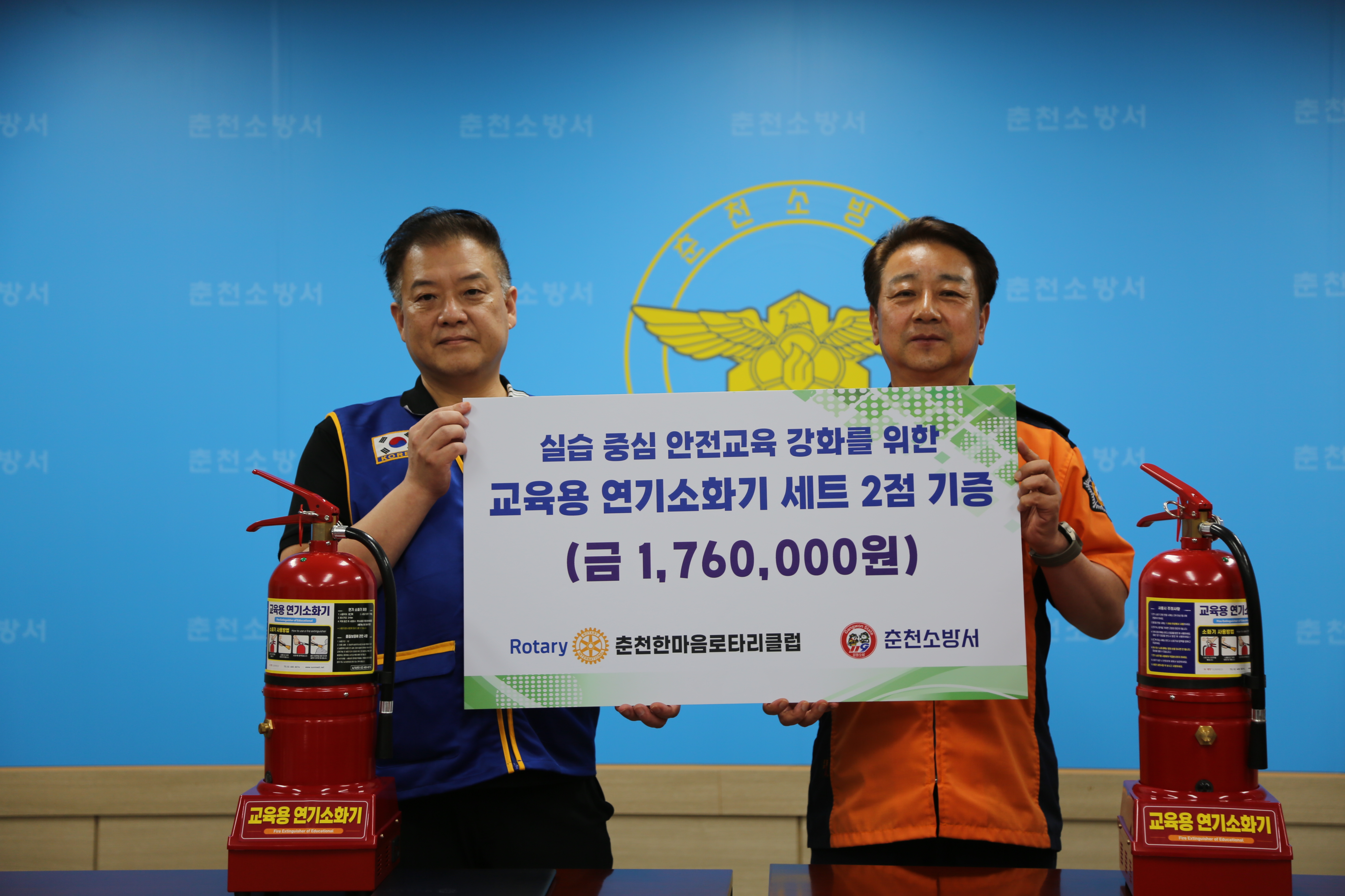 춘천한마음로타리클럽으로부터 화재예방교육 물품 기증받아.