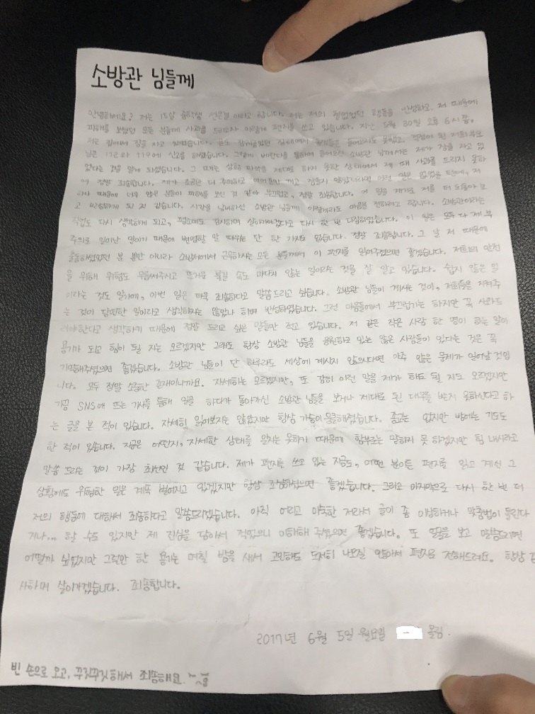2017년 5월 30일 18:23경 구조,구급 출동건과 관련하여 신고자 따님(요구조자)께서 감사하다는 편지를 직접 소방서로 가지고 온 내용이 있어 알려드립니다.
