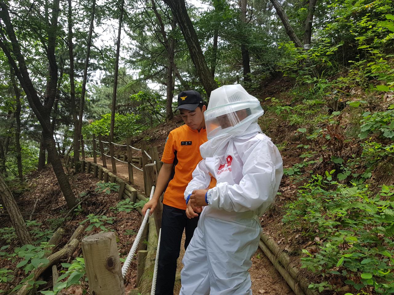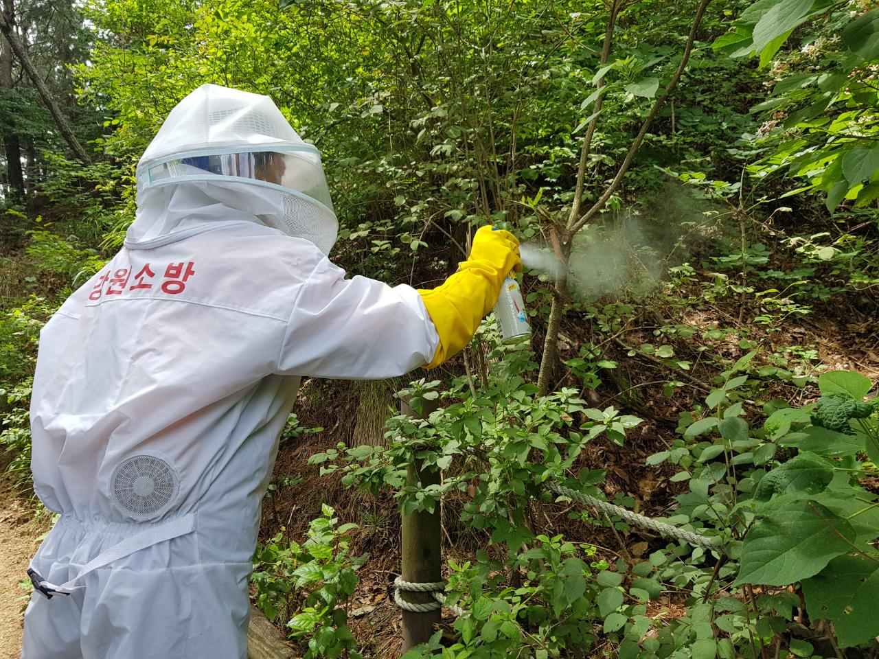 오늘 춘천소방서 구급대원들이 드름산 등산로변에 있는 벌집을 제거해 주셨다.