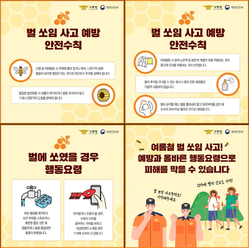 여름철 벌 쏘임 사고 예방과 올바른 행동요령으로 피해를 막을 수 있습니다.