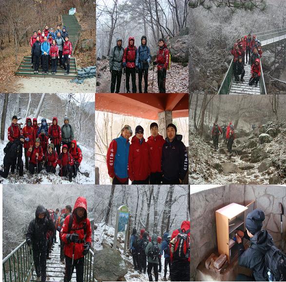 백두대간 종주를 목표로 등산하는 등산객들이 늘어남에 따라 관내를 통과하는 백두대간 등산로를 파악하여 산악사고 발생시 구조대원들의 신속한 현장 접근을 위한 지리조사 및 사원터 대피소 간이구급합 정비, 다양한 산악사고에 대응하기 위한 기술습득 및 대응능력을 배양하고자 2009년 12월 5일(09:00~18:00) 119구조대 4명 천곡안전센터 3명 북삼안전센터 6명은 눈보라 몰아치는 무릉계곡-사원터-연칠성령-고적대에서 산악훈련을 실시하였습니다. ^^*