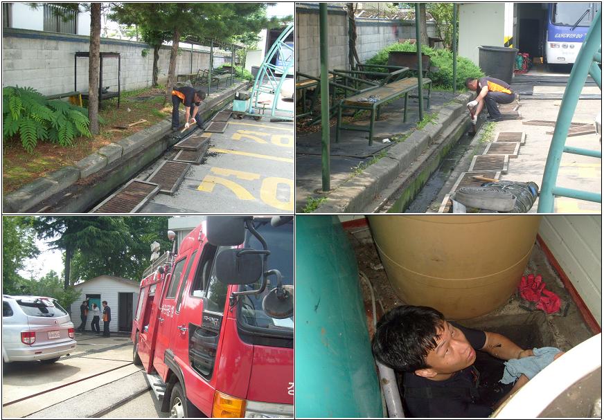 7월 5일~6일 천곡119안전센터에서는 여름철 집중호우를 대비하여 청사내 하수관 정비작업을 실시하였습니다. 1팀,2팀 직원분들이 수고해주셨으며 김윤기 부장과 백승대 반장은 맨홀 내부 작업으로 무척 고생하셨습니다.