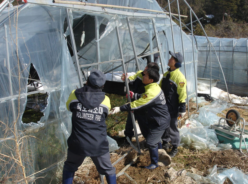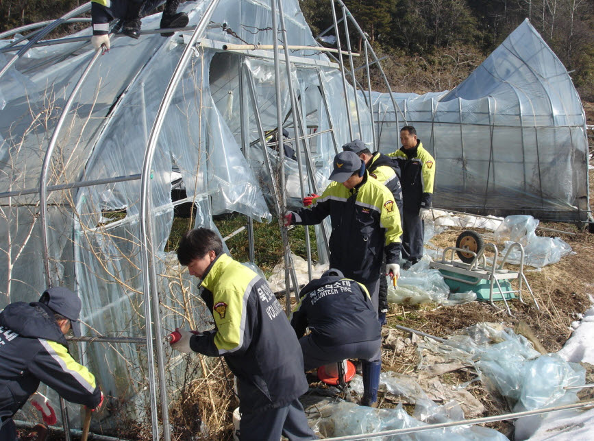 이는 지난 2월 영동지역에 내린 기록적인 폭설로 인하여 폭삭 무너져 큰 피해를 입은 김창기씨 댁 비닐하우스 2동을 철거하기 위하여 전 대원이 봉사활동에 참여하게 된 것이다.