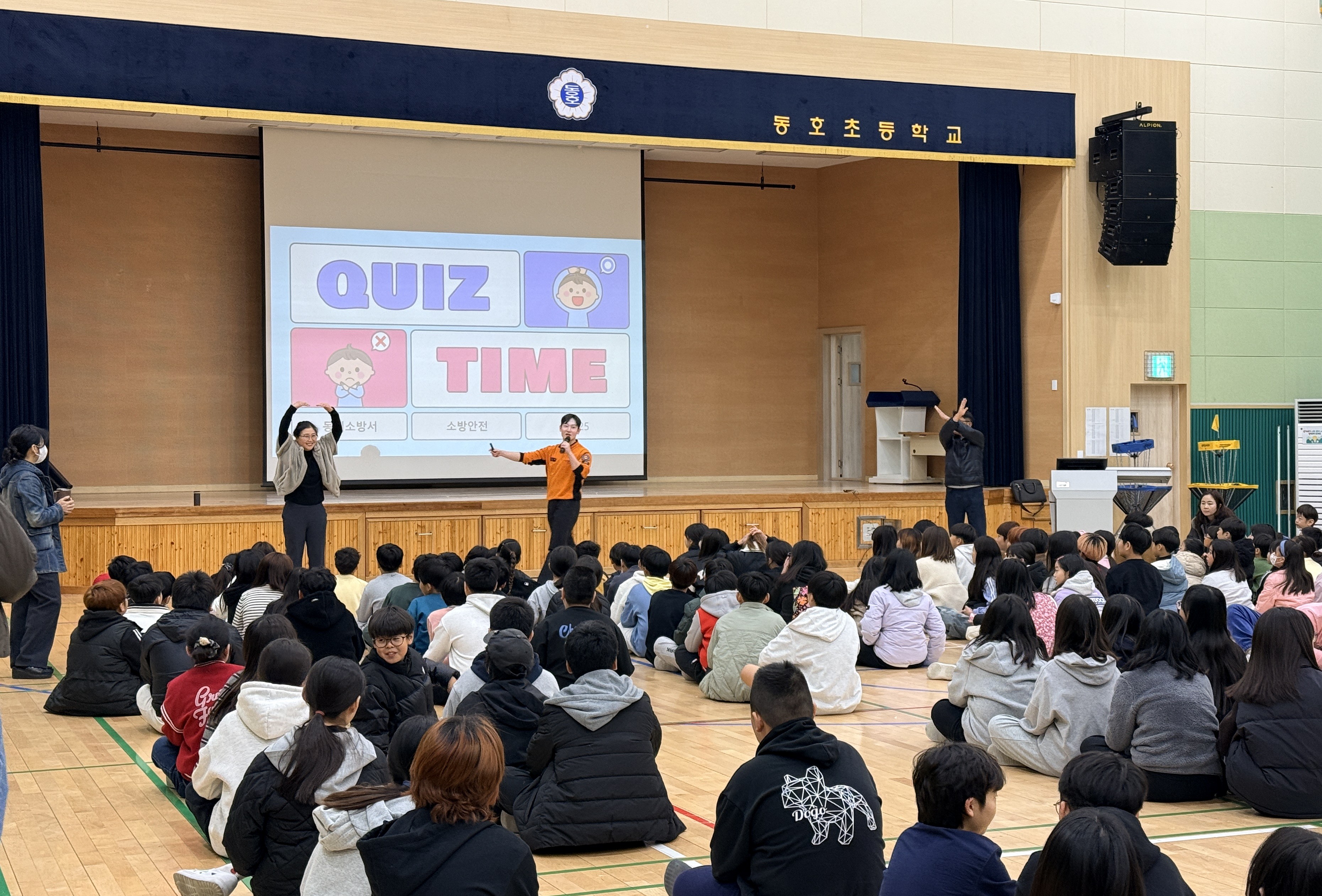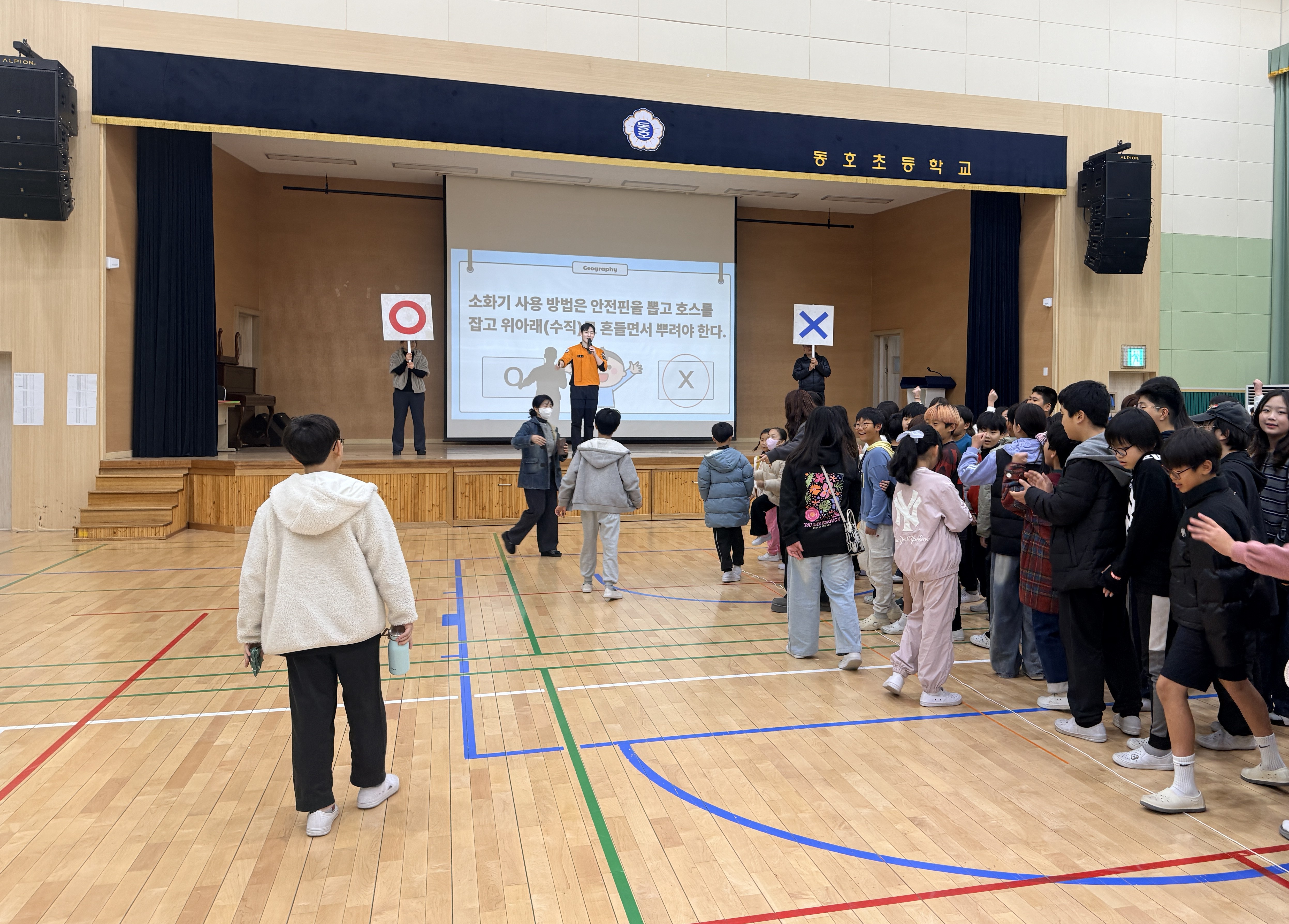 O/X 퀴즈는 화재예방, 응급처치, 자연재난, 생활안전 등 어린이들이 일상에서 접할 수 있는 다양한 상황을 주제로 구성됐으며, 동호초등학교 학생 180여 명이 참여해 총 20문항의 문제를 풀며 안전 상황을 판단하고 올바른 행동요령을 익히는 시간을 가졌다.