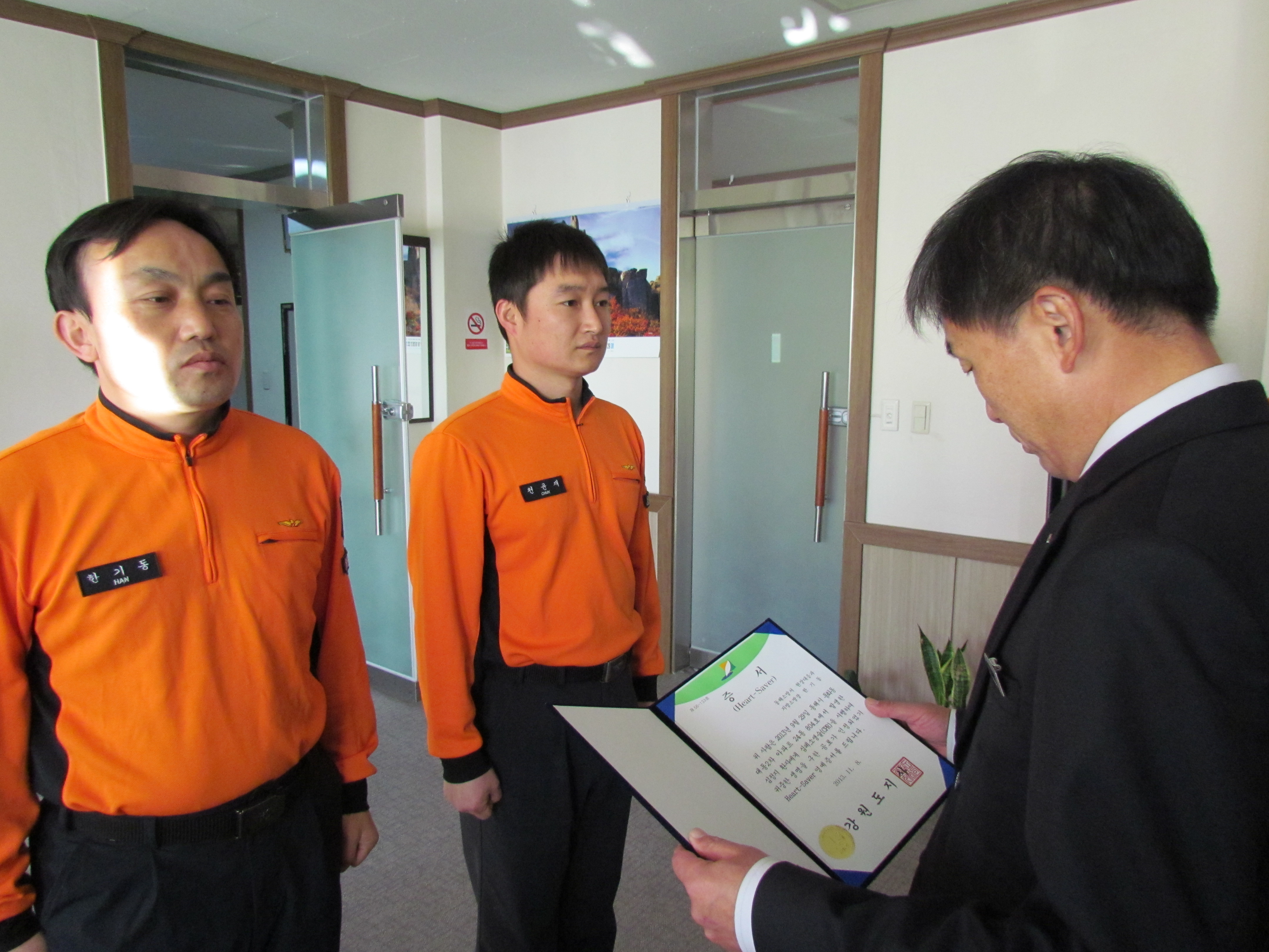 ○ 동해소방서(서장 김남백)는11일 9시에 서장실에서 구급대원 한기동 소방장, 천윤재 소방장에게 하트세이버 인증서 및 뱃지를 수여했다.