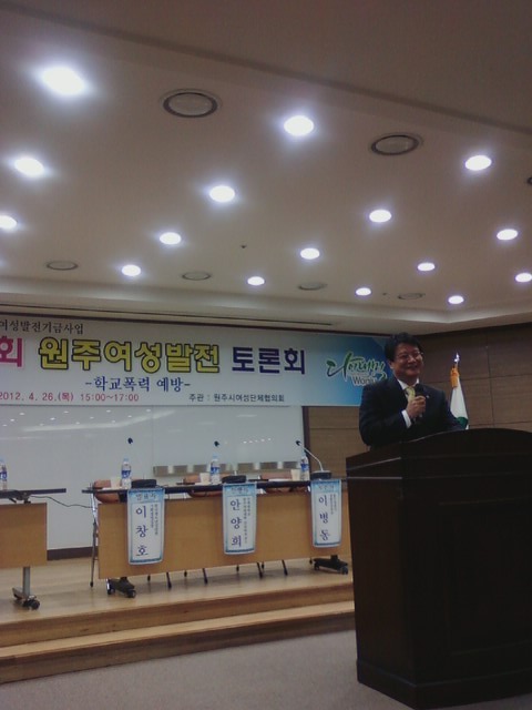 흥업여성대(대장오오석)에서는 2012년 4월 26일 오후3시부터 원주시청 다목적홀에서 열리는 `제6회 여성발전토론회'에 참석하과 왔습니다.원창묵원주시장님, 지은희 원주시여성단체협의회장,여성단체협의회원등 200여명이 참석하였습니다.자유롭고 안전한 지역사회를 만들기 위한 "학교폭력예방"을 주제로 토론이 진행되었습니다.학교폭력 예방을 위한 역활과 실천방안을 제안하고, 자유롭고 안전한 지역사회만들기 위해 저희 여성의용소방대원들도 힘써 돕겠습니다.