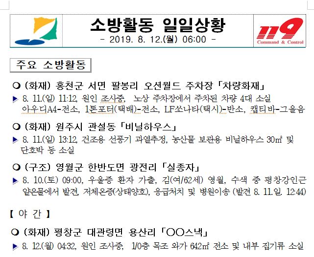 소방활동 일일상황(8. 12. 월) 06:00