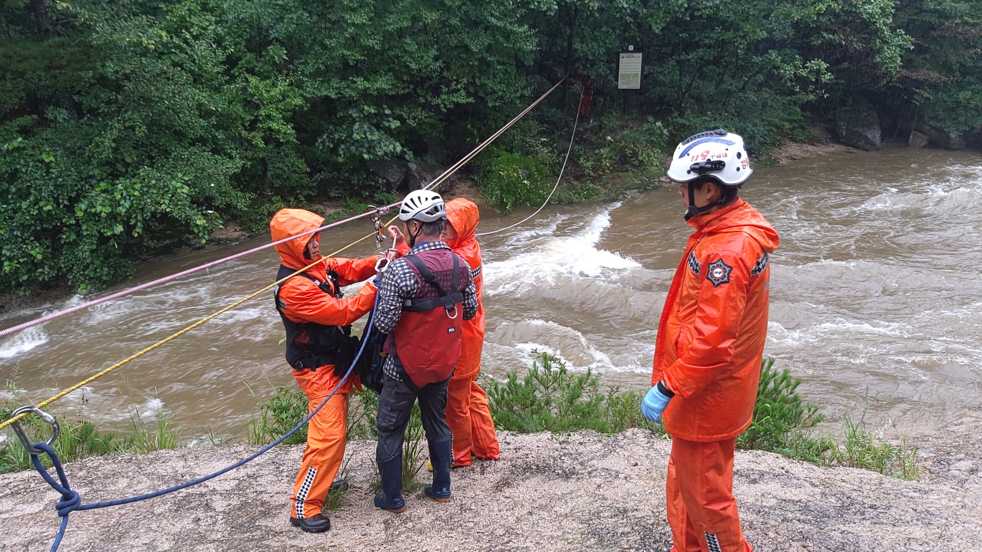 - 내용 : 산행 중 계곡물이 불어 고립된 상황으로 구조대 출동 로프를 이용하여 안전하게 구조 후