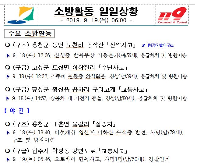 소방활동 일일상황 (9. 19. 목) 06:00