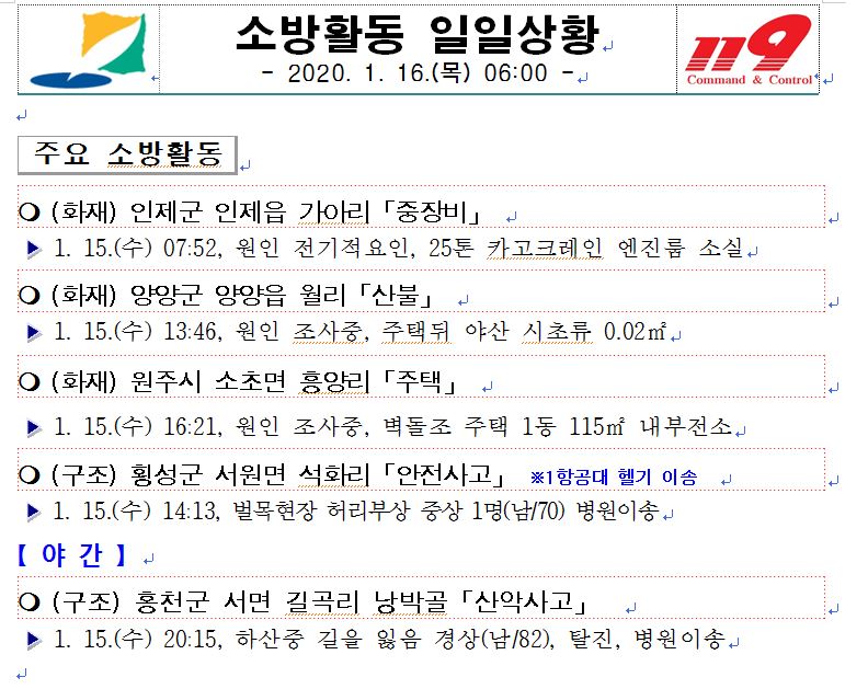 소방활동 일일상황 (1. 16. 목) 06:00