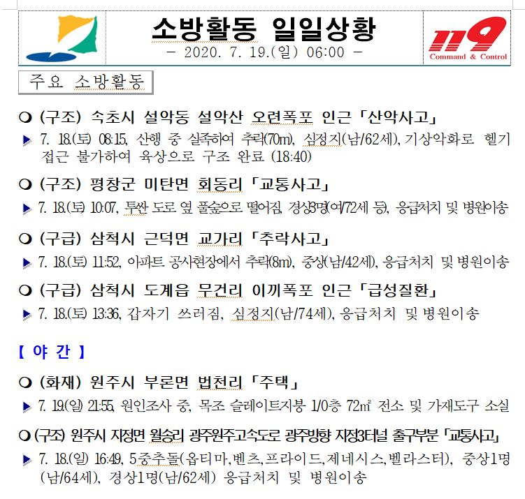 소방활동 일일상황 (7. 19. 일) 06:00