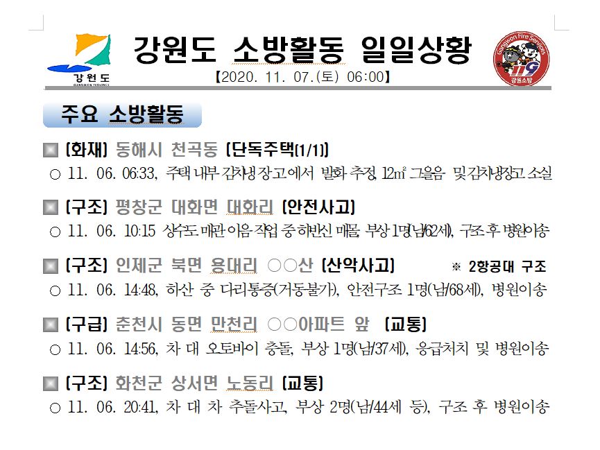 강원도 소방활동 일일상황(11. 7. 토) 06:00