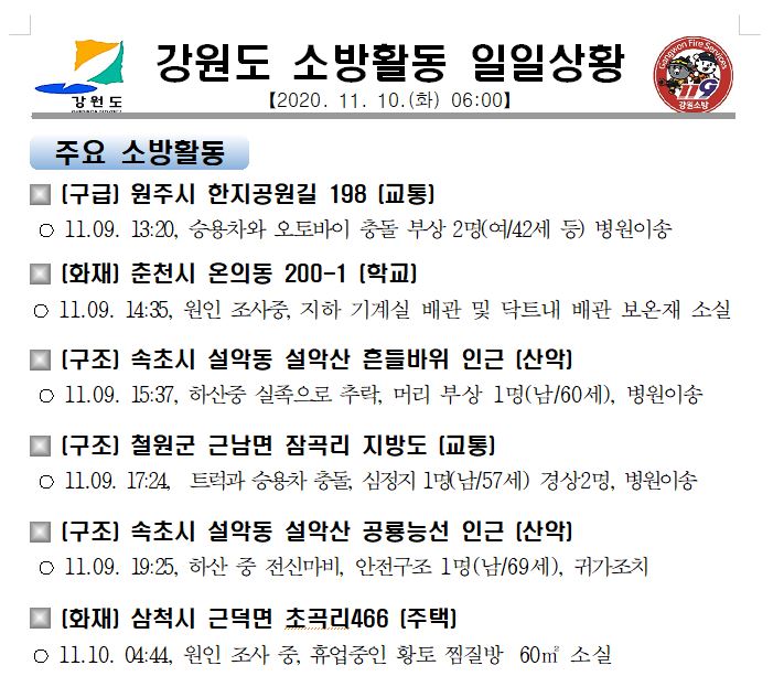 강원도 소방활동 일일상황(11.10.화) 06:00