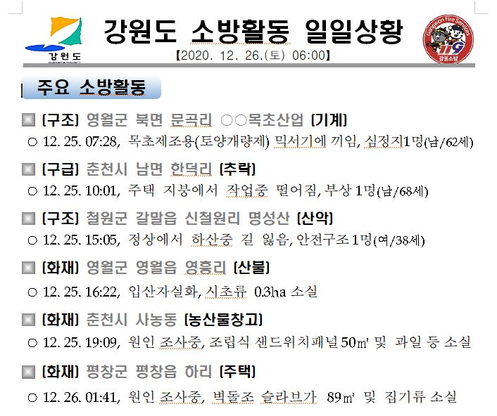 강원도 소방활동 일일상황(12. 26. 토) 06:00