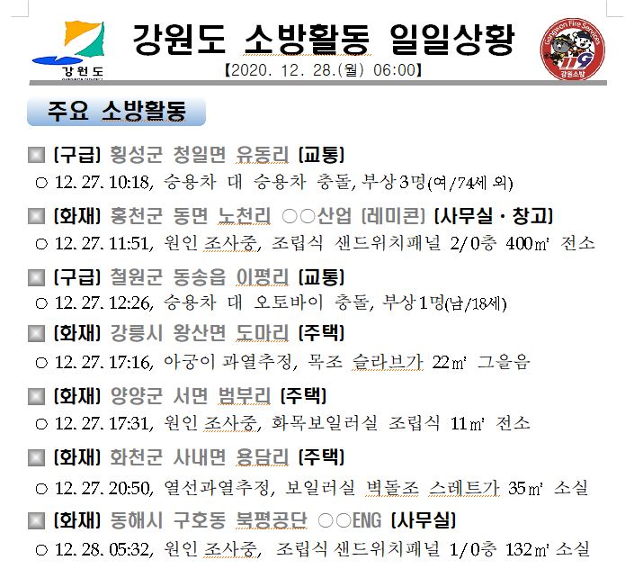 강원도 소방활동 일일상황(12. 28. 월) 06:00