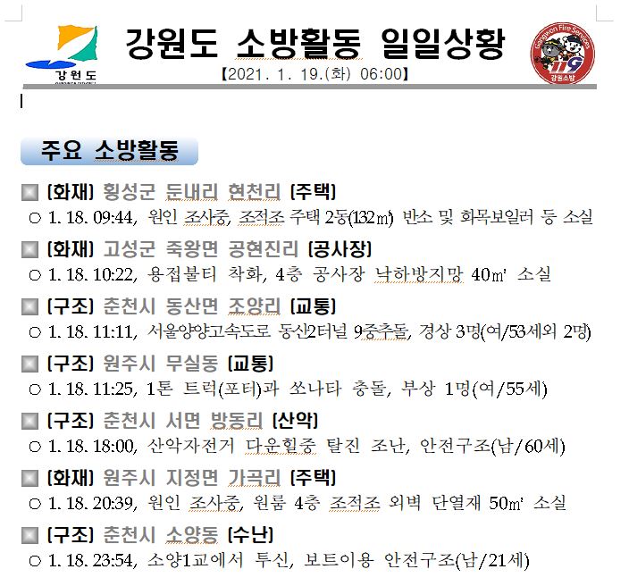 강원도 소방활동 일일상황(1. 19. 화) 06:00