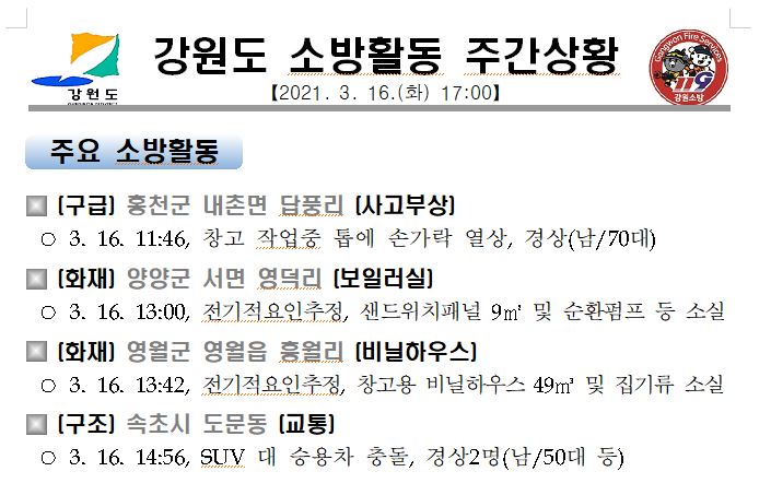 강원도 소방활동 주간상황(3. 16. 화) 17:00