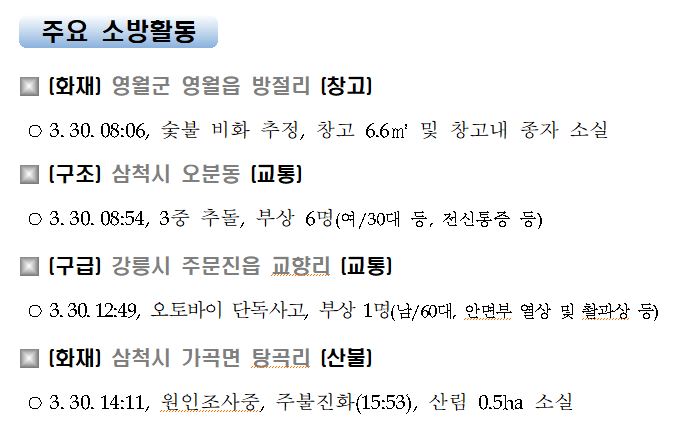 강원도 소방활동 주간상황(3. 30. 화) 17:00
