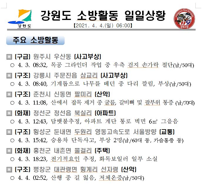 강원도 소방활동 일일상황 (4. 4. 일) 06:00