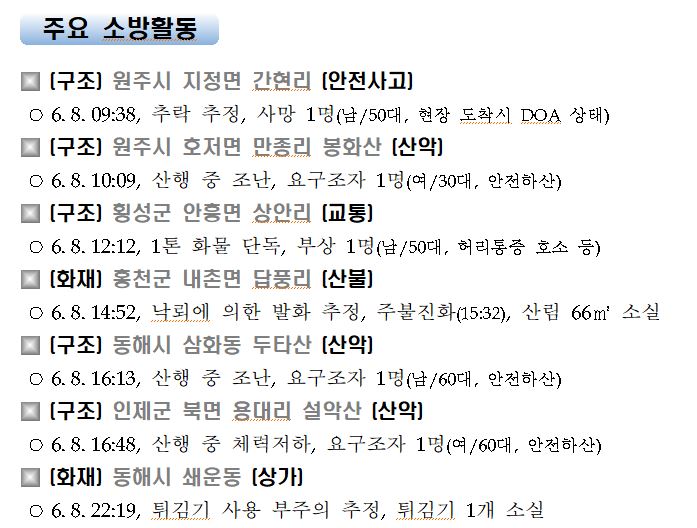 강원도 소방활동 일일상황 (6. 9. 수) 06:00