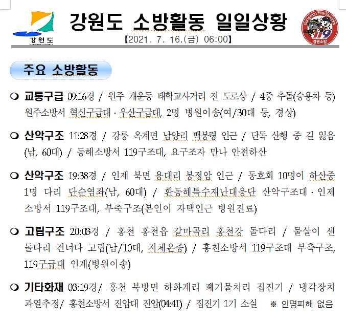 강원도 소방활동 일일상황 (7. 16. 금) 06:00