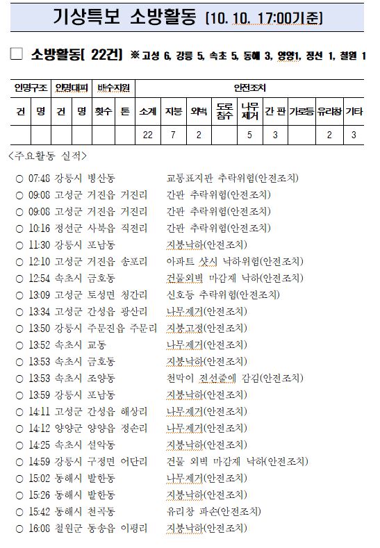 119 소방활동 상황보고(10. 10. 월) 17:00 및 강풍재해 소방활동