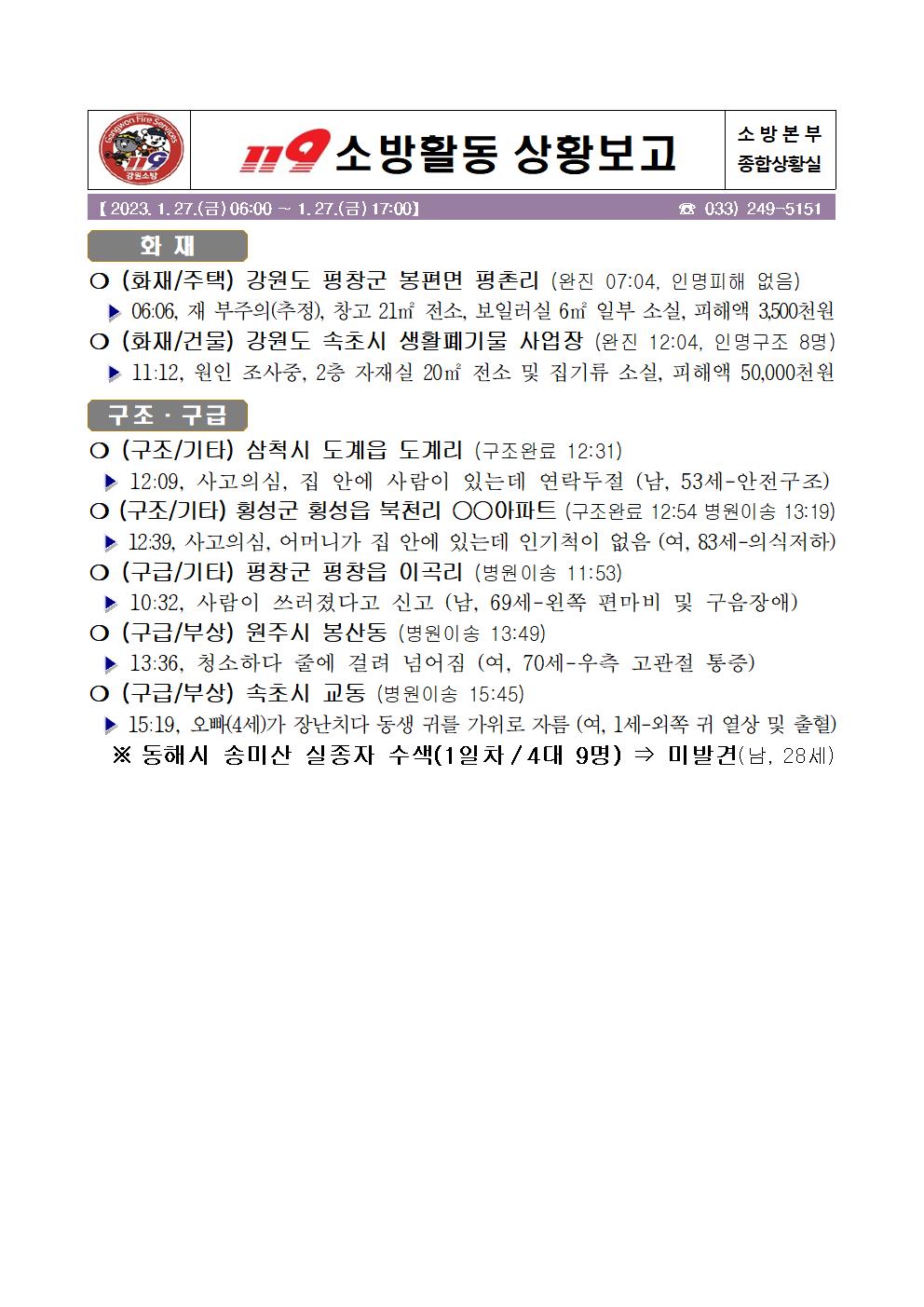 119 소방활동 상황보고(1. 27. 금) 17:00