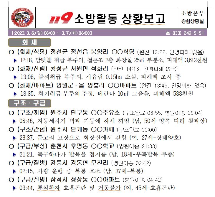 119 소방활동 상황보고(3. 7. 화) 06:00