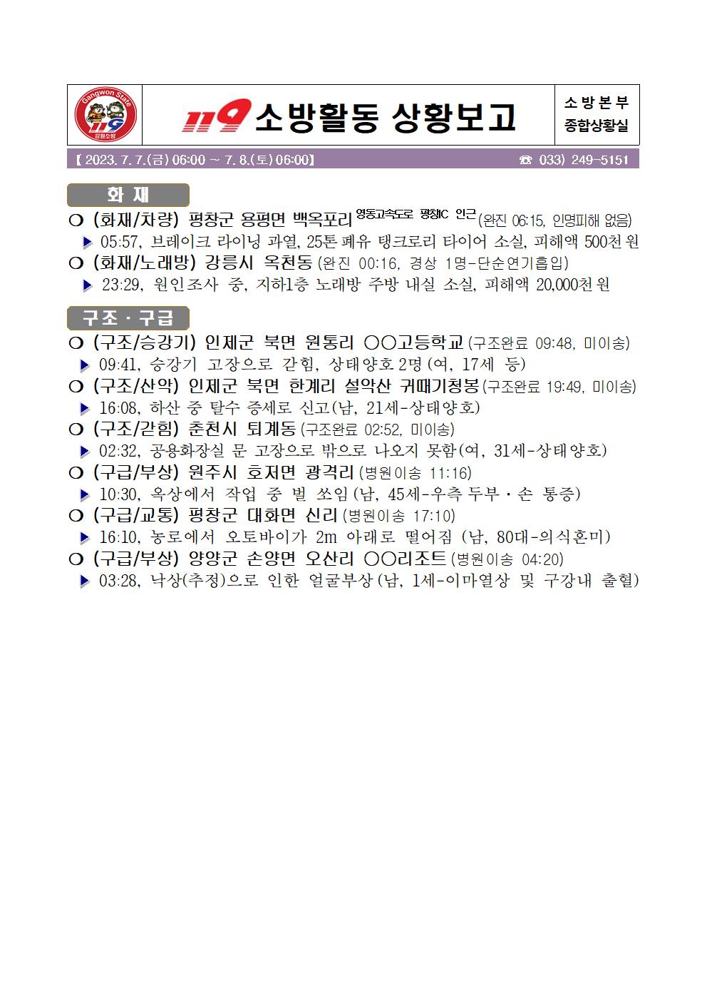 119 소방활동 일일상황보고(7. 8.토) 06:00