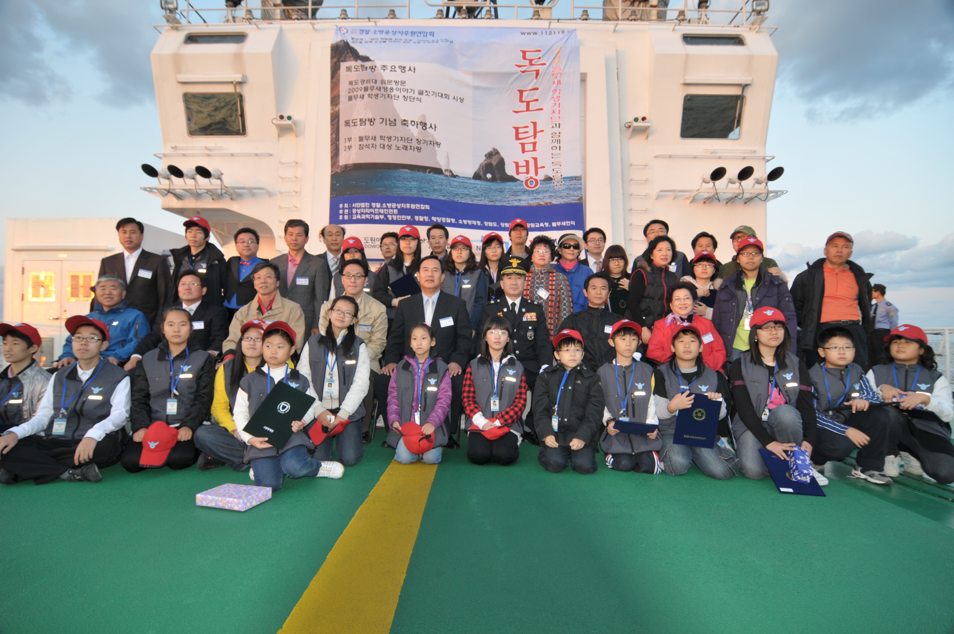 왕재섭본부장님 독도앞바다 함정에서 들무새영웅글짓기대회 수상자들과..