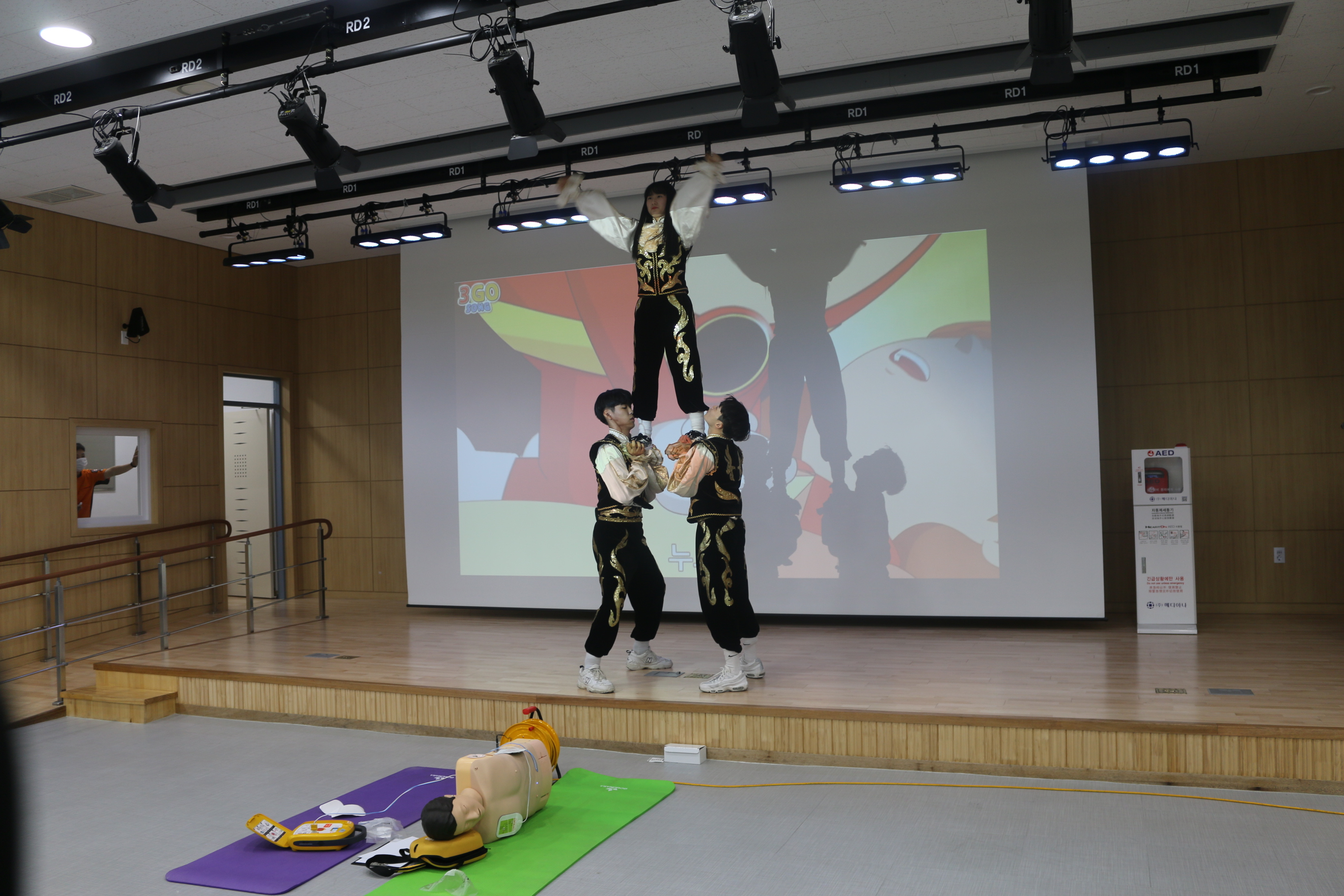 이날 대회에서 ‘RESCUE’팀은 치어리더 공연 중 한명이 심정지가 발생해 쓰러지는 상황을 가정해, 심정지 환자 발생 시 당황하지 않고 미리 배워둔 심폐소생술과 119신고요령을 활용하고, 인근에 배치되어있던 자동제세동기를 이용해 심폐소생술을 실시해 환자를 소생시키는 퍼포먼스를 벌였다.