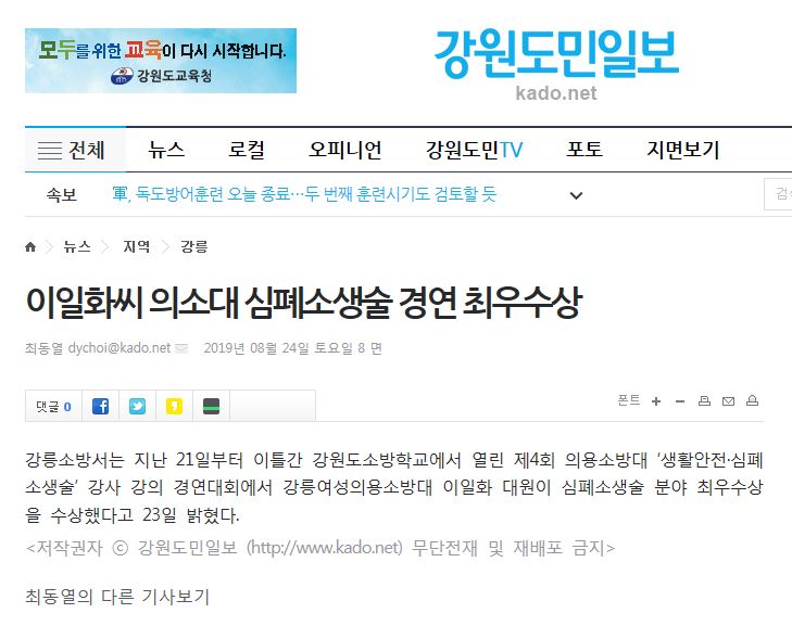 | 24087 | (강릉) 이일화 강릉여성의소대원 심폐소생술 경진대회 최우수상 수상 | 강릉홍보 | 2019-08-23 | 368 | |