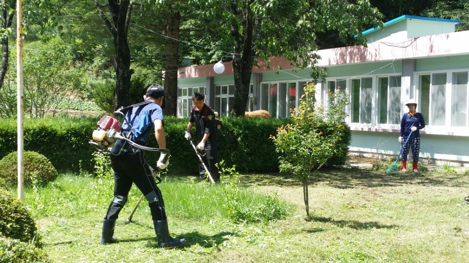 삼척소방서 의용소방 119특별기동대 대장 이천우외 13명대원은 2015년 7월18일(토) 삼척시 하장면 벌문재로 1009번지 (구토산분교)내 나무심는지역아동센터에 나무와 잔디와 운동장내에 풀밭과 개울을 따라 하얀 연기를 품으며 소독방역을 하였으며, 예치기 여러대를 이용하여 잔디(화단) 제초작업을 하여 센터내 환경을 아름답고 안전하고 만들어 주었습니다. 그리고 창고 및 운동장 곳곳에 청소까지 더운날씨에도 불구하고 대원들의 환한 미소와 땀을 흘리며 봉사하는 모습을 보며 감사하는 마음으로 칭찬글을 올립니다.