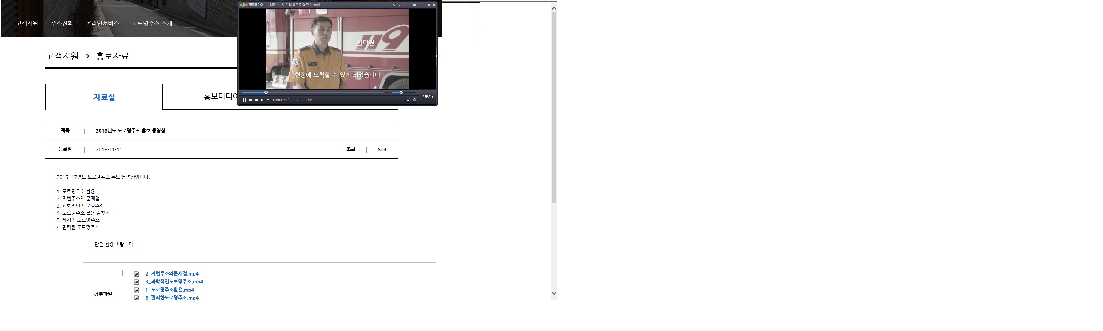 홍보동영상은 행정자치부 도로명주소 홈페이지 고객지원> 홍보자료에서 2016년도 도로명주소 홍보동영상 6번