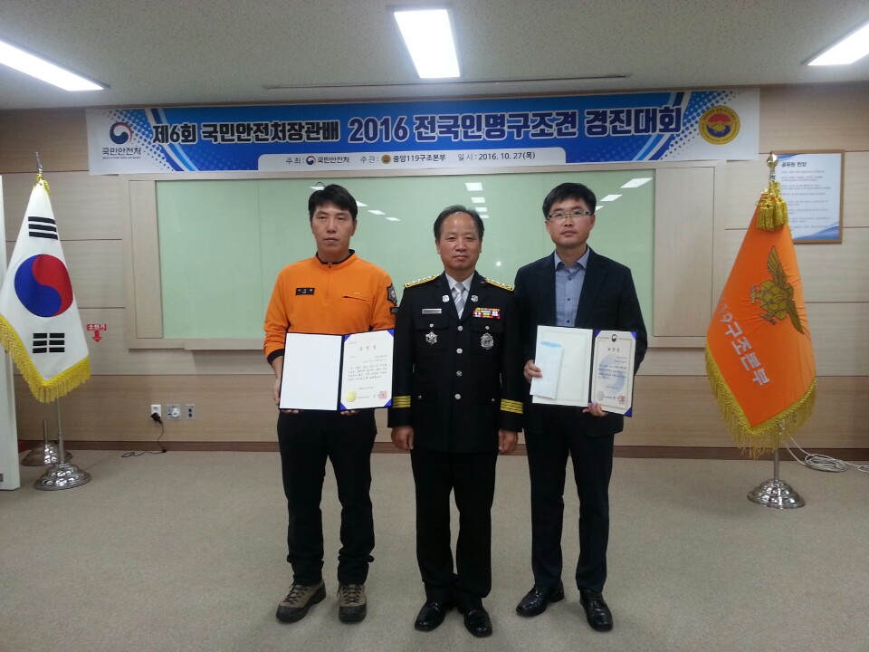 강원도소방본부(본부장 이흥교)는 27일 오후 3시 중앙119구조본부에서 열린 2016년 전국 인명구조견 경진대회에서 2년 연속 전국 119인명구조견 우수기관으로 선정되어 국민안전처장관 표창을 수상했다.