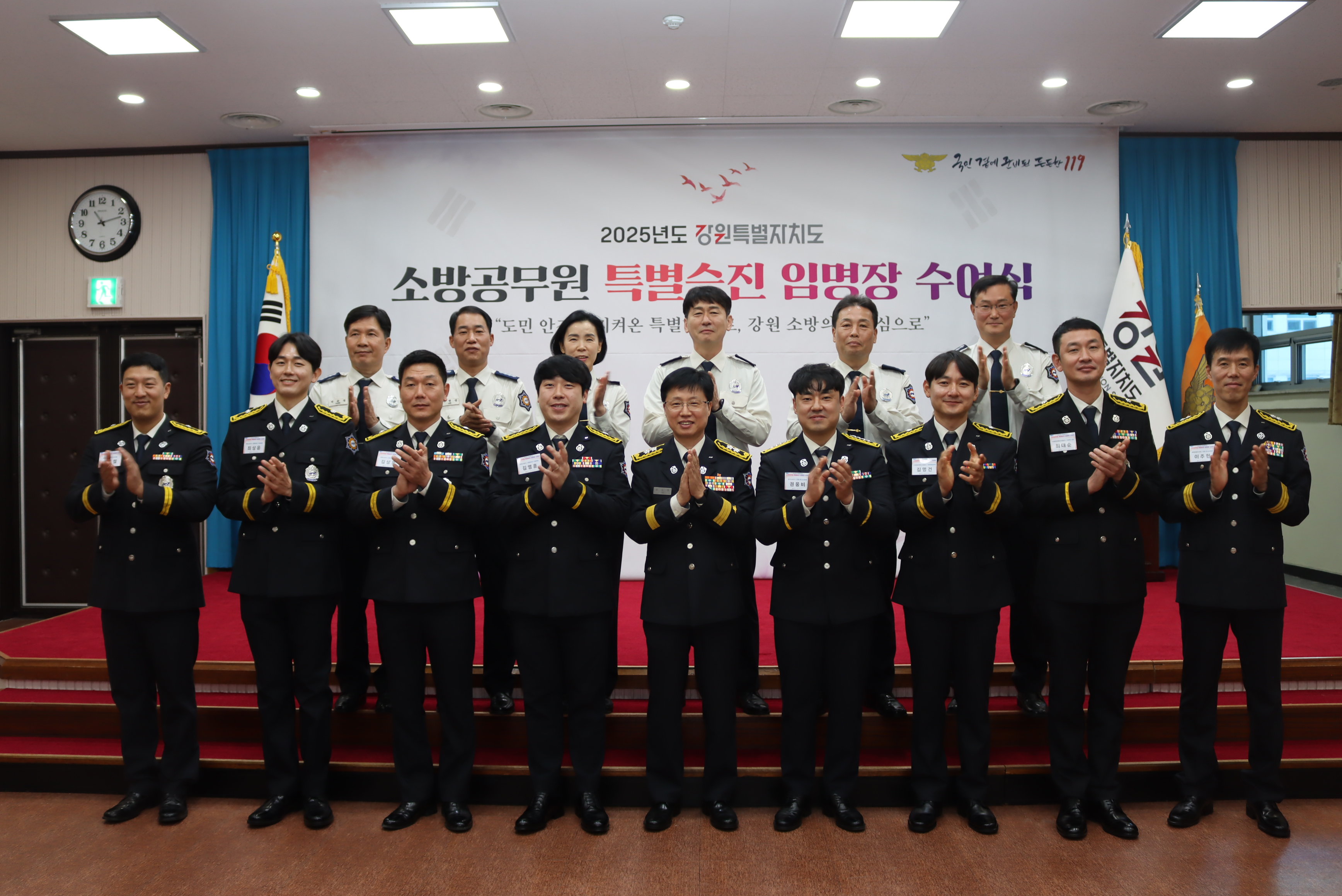 김진태 강원특별자치도지사는 도민의 생명을 지키기 위해 묵묵히 헌신해 온 소방관분들의 노고에 깊이 감사드린다이번 특별승진이 현장에서의 책임감을 더욱 단단하게 하고, 도민 안전을 지켜내는 데 큰 힘이 되길 바란다고 격려했다.