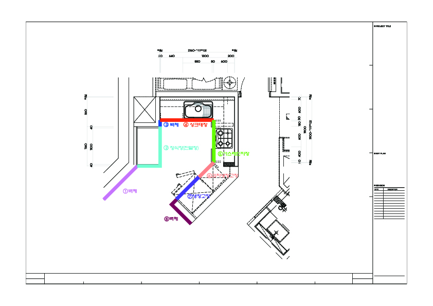상황: ①벽체 ②장식장(진열장) ③벽체 ④주방가구(씽크대장) ⑤주방가구(가스레인지장)