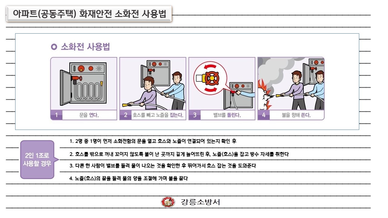 | 1149 | 아파트(공동주택) 화재안전 소화전 사용법 | 강릉홍보 | 2023-02-01 | 586 | |