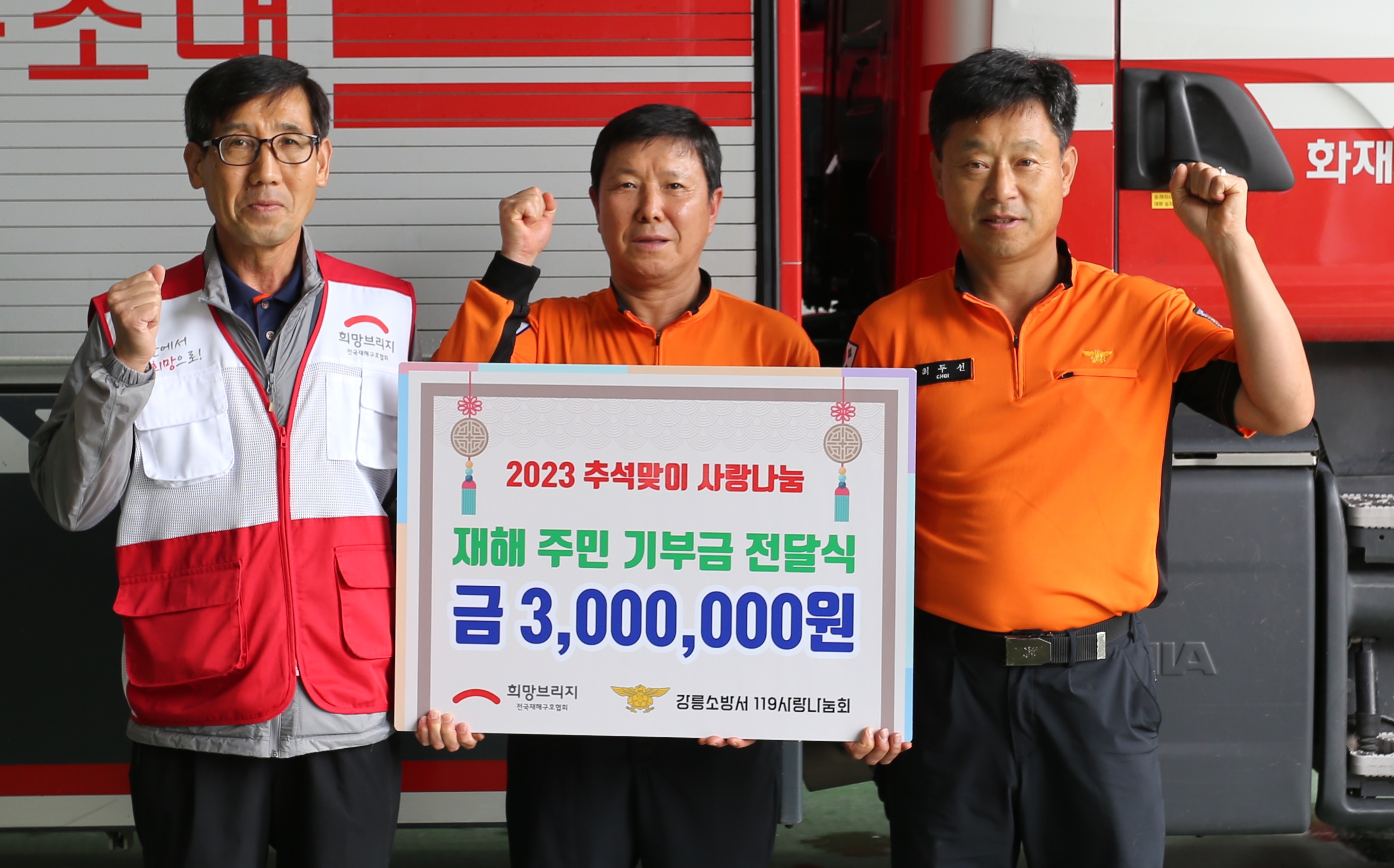금일 강릉소방서 119사랑나눔회는 다가오는 추석 명절을 맞아 희망브리지 '전국재난재해구호협회'에전 직원이 모금한 성금(300만원)을 전달했습니다.