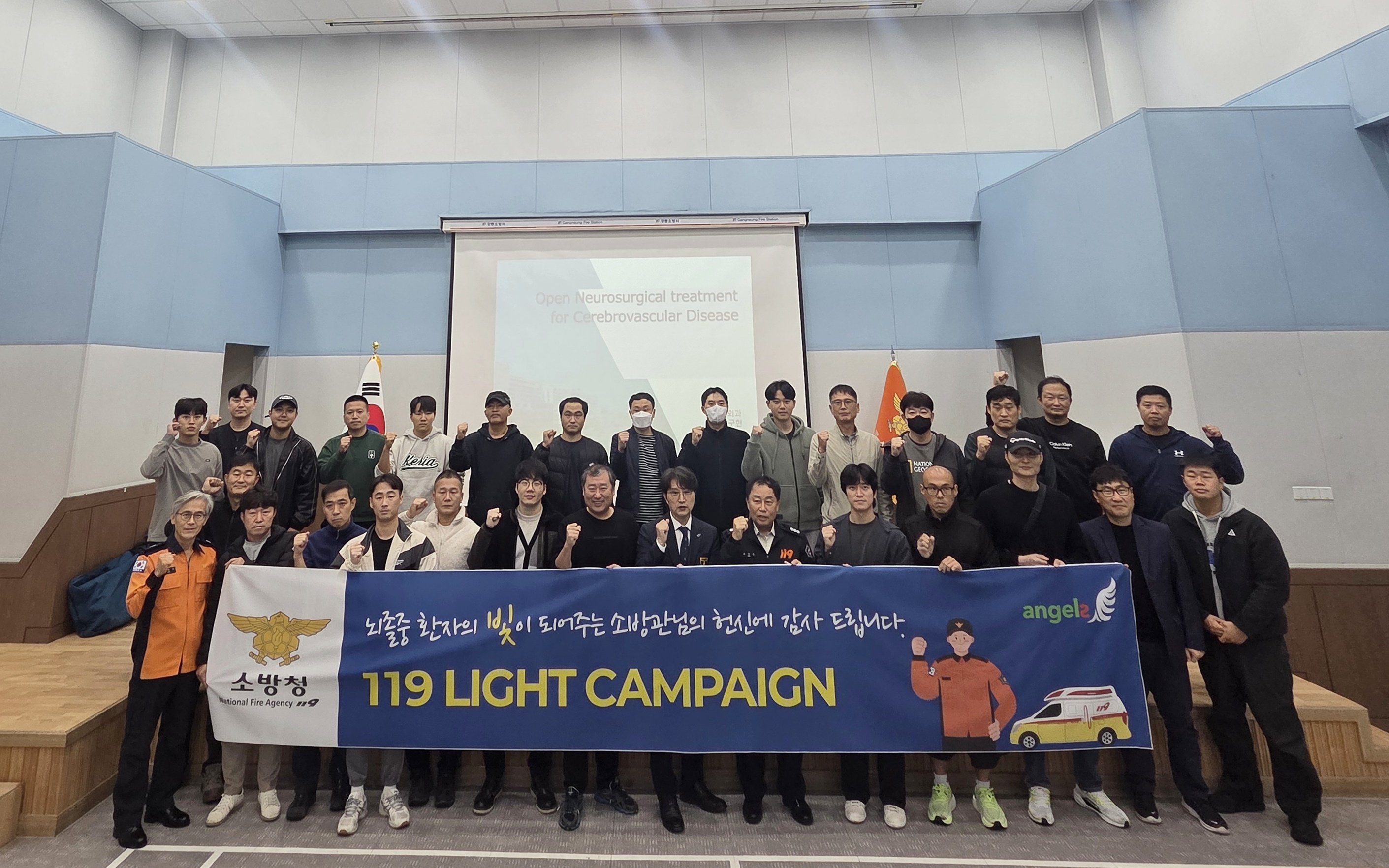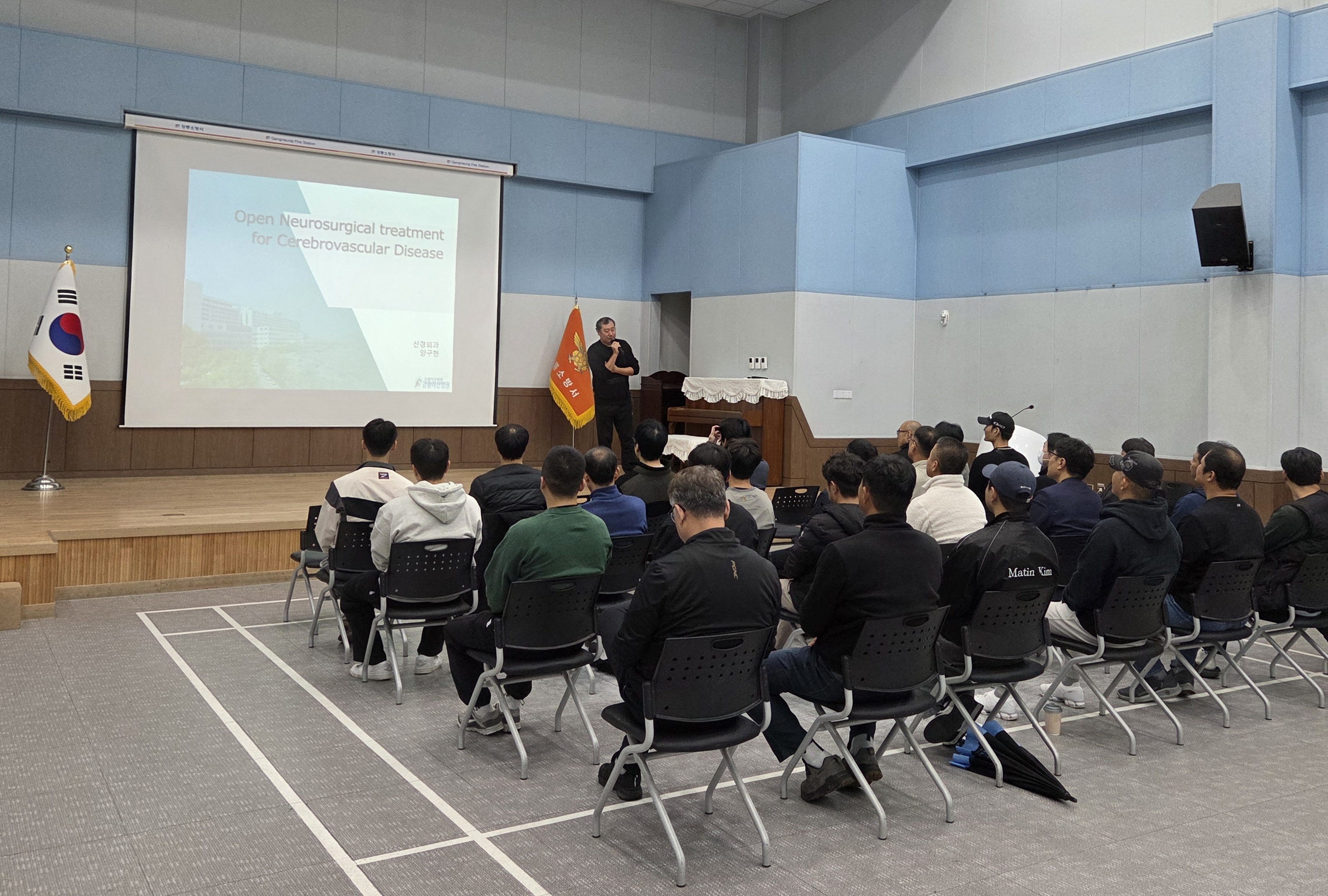 강릉소방서 구급대원 및 펌뷸런스 대원 33명이 참석하였으며 강릉아산병원 뇌졸증센터 양구현 센터장님께서 재능기부로 뇌졸증 초기진단 및 응급처치교육 실시하였습니다.