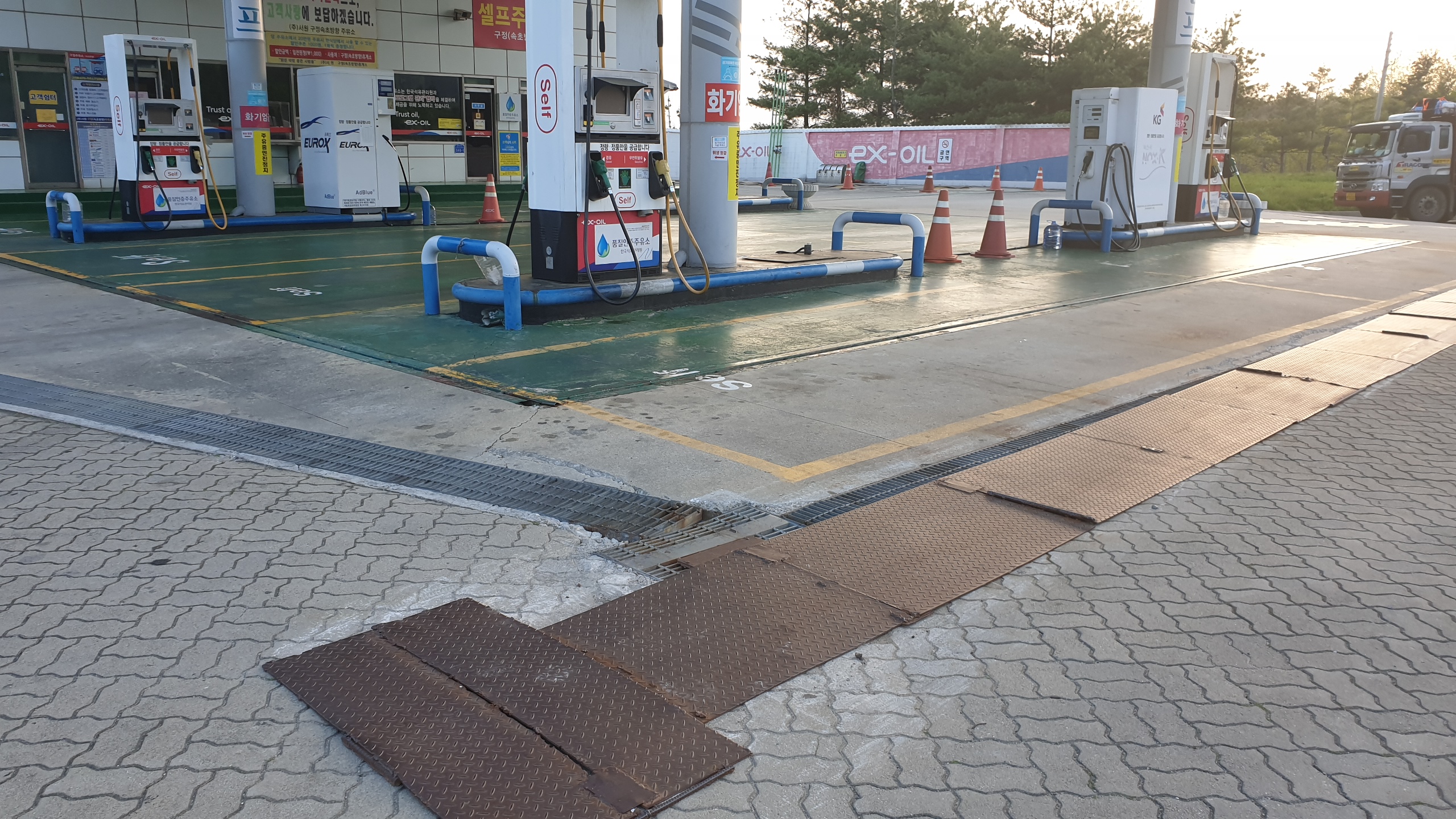 주유소 주변 배수로가 미관상 보기 싫고, 배수로 덮개 및 트렌치 파손으로 인해