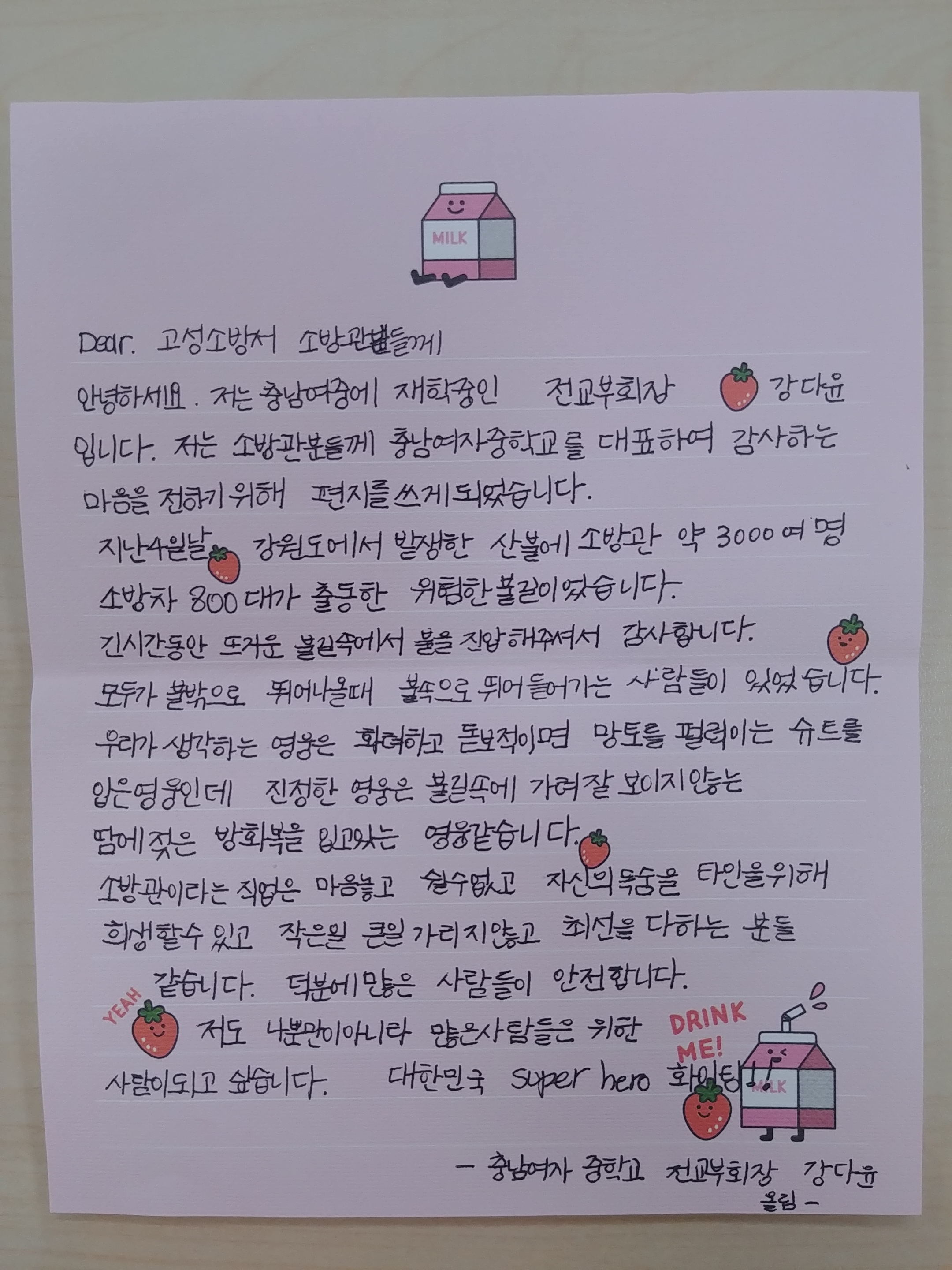 18일 오전 10시께 충남여자중학교 전교 학생회장과 부회장은 고성소방서 소방대원분들께 드리는 편지라며 직접 손편지를 작성하여 소방서에 보내왔다.