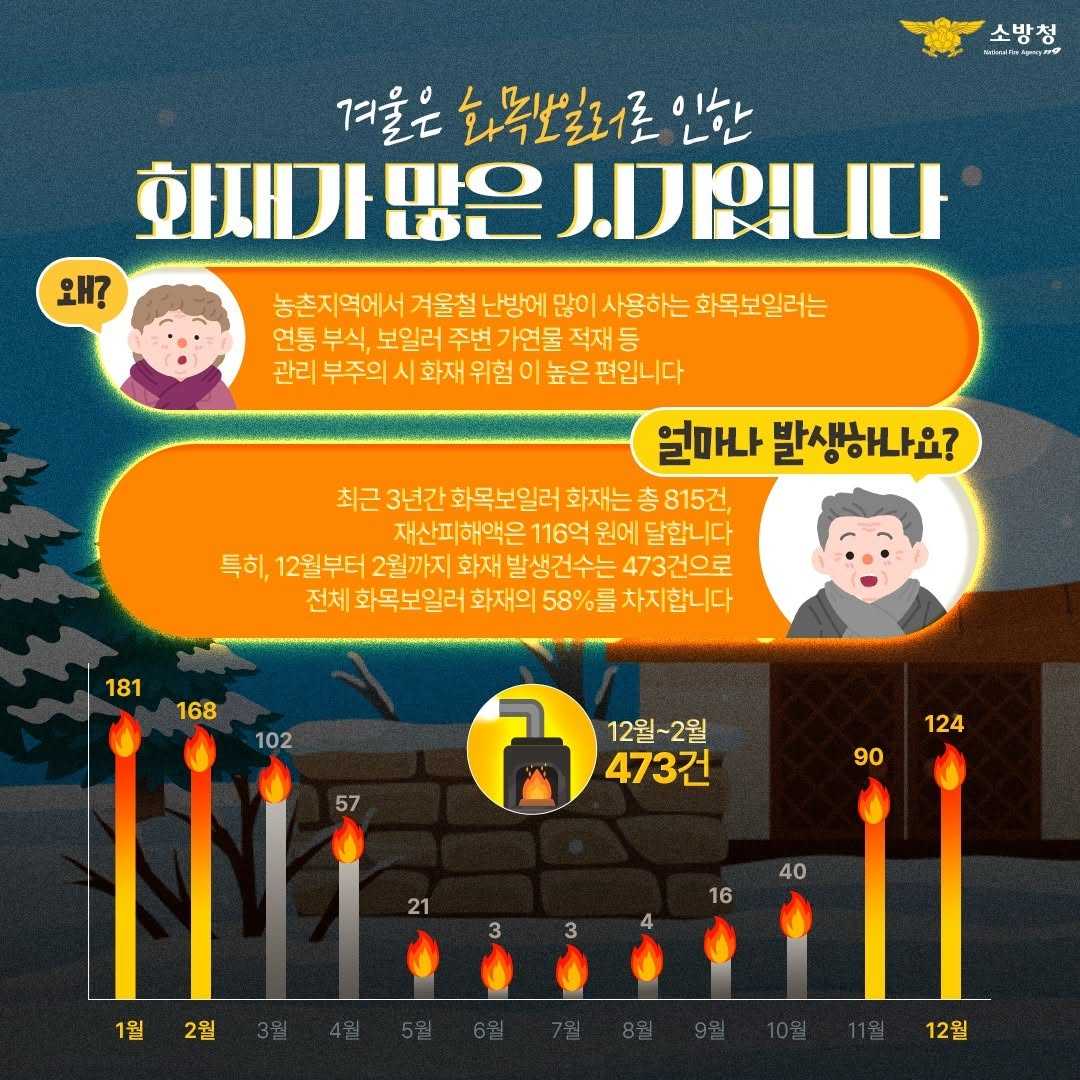 화목보일러 사용법 알아두시고 안전하고 즐거운 겨울철 보내세요~  < 화목보일러 안전수칙 > ✔ 사용 전 점검하기 ✔ 가연물과 보일러는 2m이상 떨어진 장소에 보관하기 ✔ 화목보일러 근처에 항상 소화기 비치하기 ✔ 연료를 한꺼번에 많이 넣지 않기 ✔ 연료 투입 후 투입구를 꼭 닫아 주기 ✔ 재는 불씨가 꺼졌나 확인하고 안전하게 처리하기 < 화목보일러 관리 > ✔ 화목보일러 정기적으로 검사하기 ✔ 화목보일러 작동 중에는 연료투입구 연통 및 배관부의 기밀성과 공기투입기의 성능 확인하기 ✔ 화목보일러를 장기간 사용하지 않는 다른 계절에는 연소실 청소하여 습기가 응축되지 않게 하기