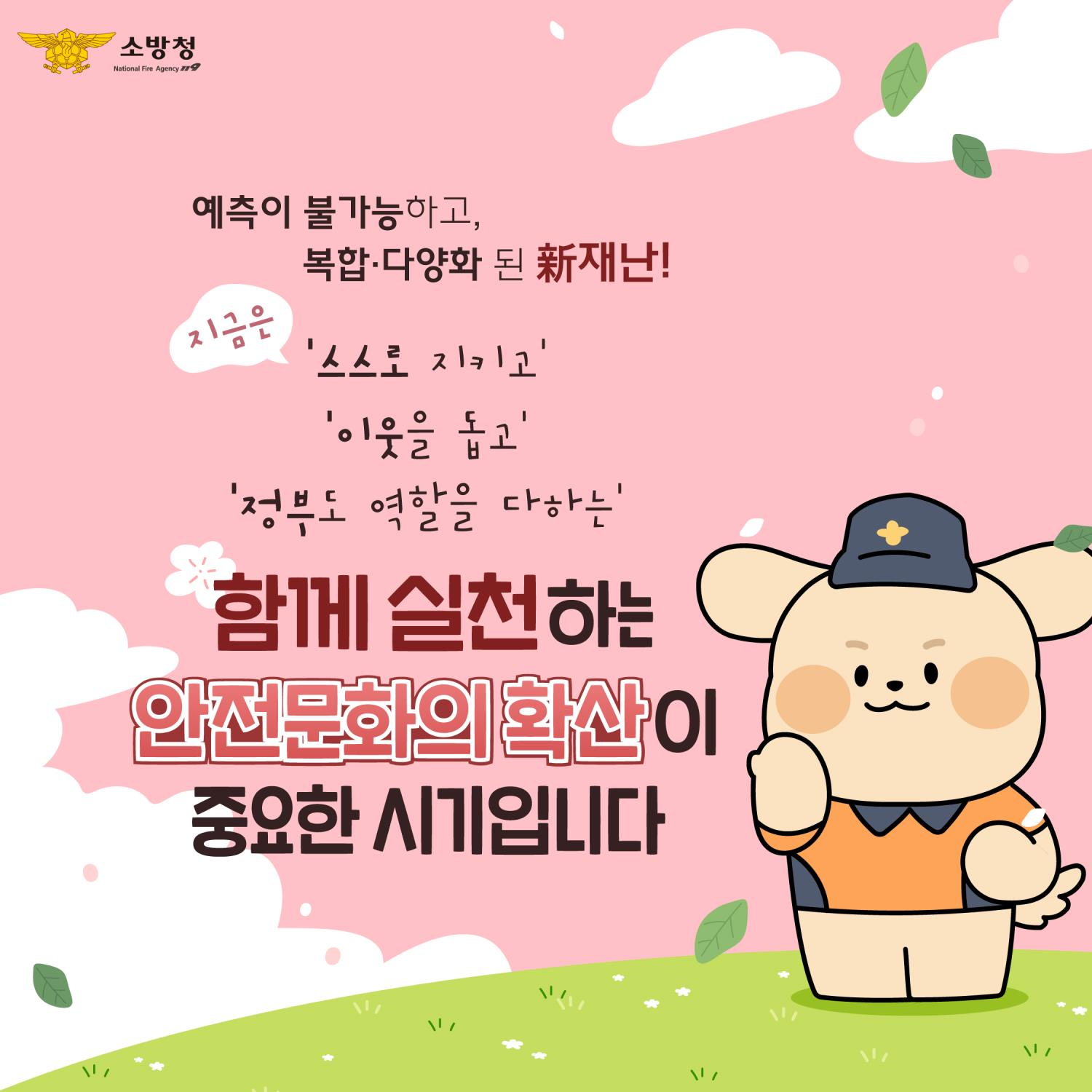 이번 활동은 복합화되고 예측 불가능한 ‘新 재난안전’에 대해 국가책임에서 ‘스스로를 지키고(By Myself), 이웃을 돕고(By Each Other), 정부 역할을 다하는(By Government)’ 내용으로 의식을 전환하고자 추진합니다.